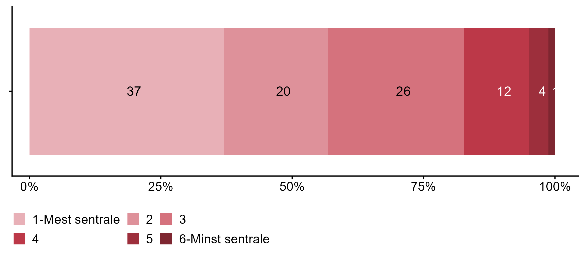 For Sentralitetsindeks seksdelt har målgruppen en lavere andel respondenter (0,05) enn alle andre (0,18) som svarte 5 eller 6-Minst sentrale.