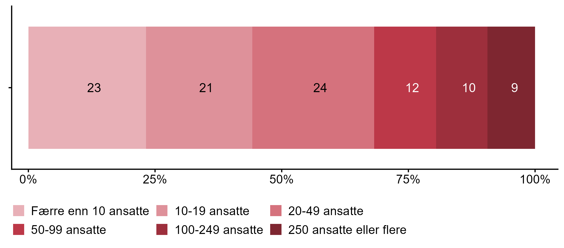 Kapittelet viser en overordnet fordeling på antall ansatte i bedrifter som har deltatt i undersøkelsen i figur 1, hvor stor andel av bedriftene som har svart fordelt på sentralitet i figur 2 og andelen svart fra hvert fylke i figur 3. Der det har vært mer oversiktlig å presentere sentralitet på en 3-delt skala har vi gjort dette.