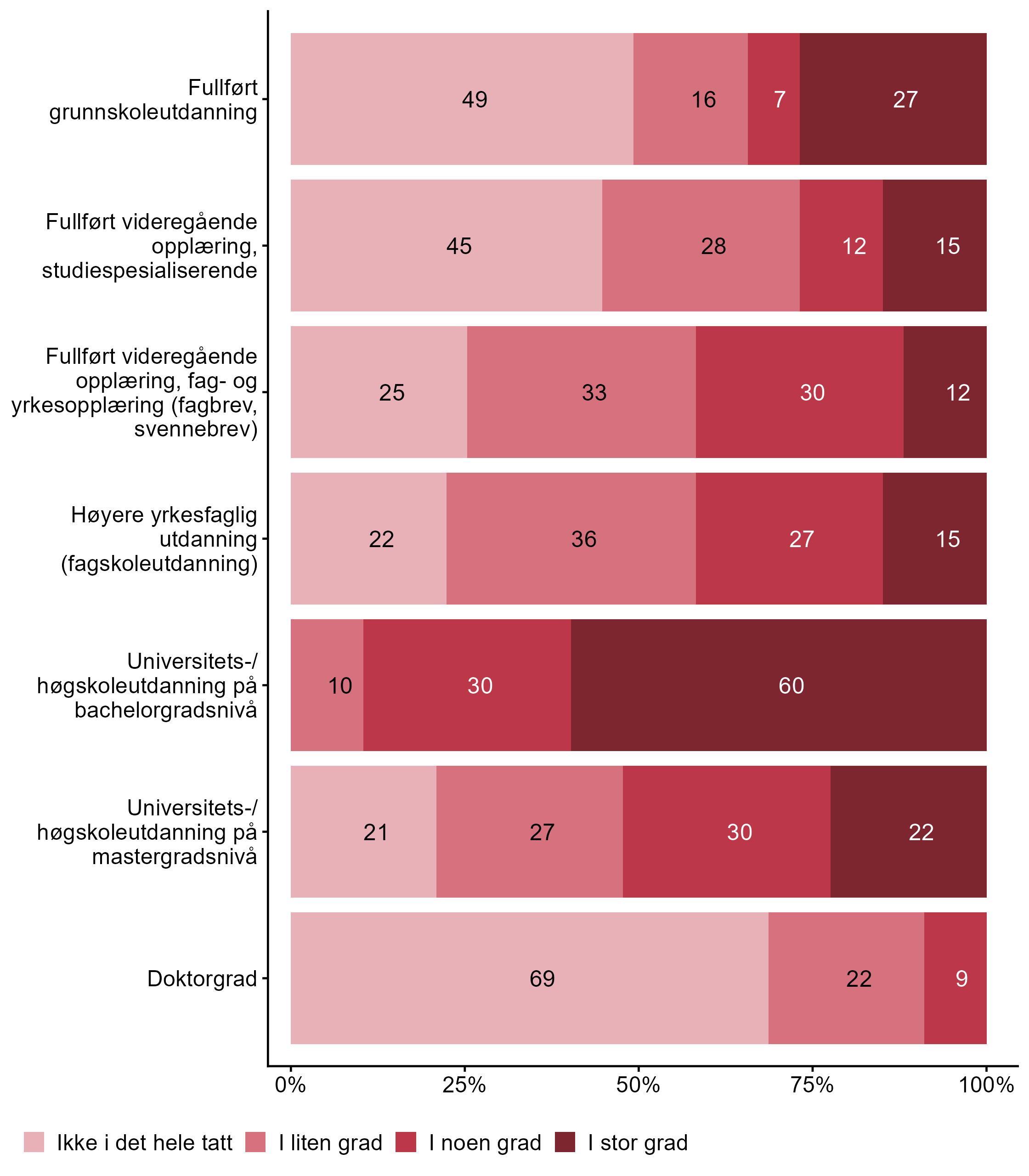 Flere respondenter svarte I liten grad eller I noen grad på Doktorgrad i målgruppen (0,31) enn for alle andre (0,21). For påstanden Universitets-/høgskoleutdanning på mastergradsnivå var det flere som svarte I noen grad eller I stor grad i målgruppen (0,52) enn blant andre (0,4). For Universitets-/høgskoleutdanning på bachelorgradsnivå har målgruppen en høyere andel respondenter (0,9) enn alle andre (0,56) som svarte I noen grad eller I stor grad. For Høyere yrkesfaglig utdanning (fagskoleutdanning) har målgruppen en lavere andel respondenter (0,42) enn alle andre (0,65) som svarte I noen grad eller I stor grad. Færre respondenter svarte I noen grad eller I stor grad for Fullført videregående opplæring, fag- og yrkesopplæring (fagbrev, svennebrev) i målgruppen (0,42) enn i andre grupper (0,74).
