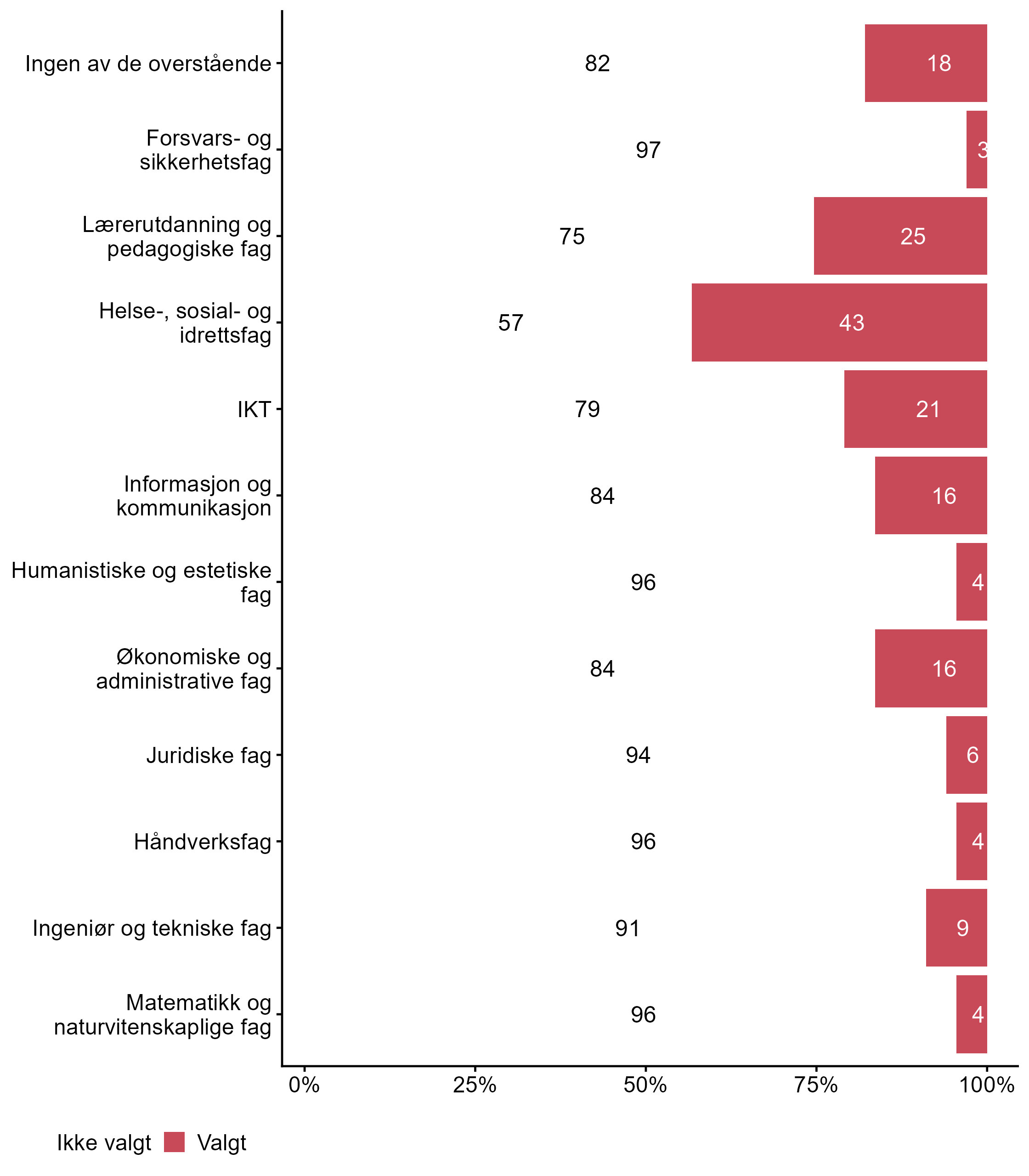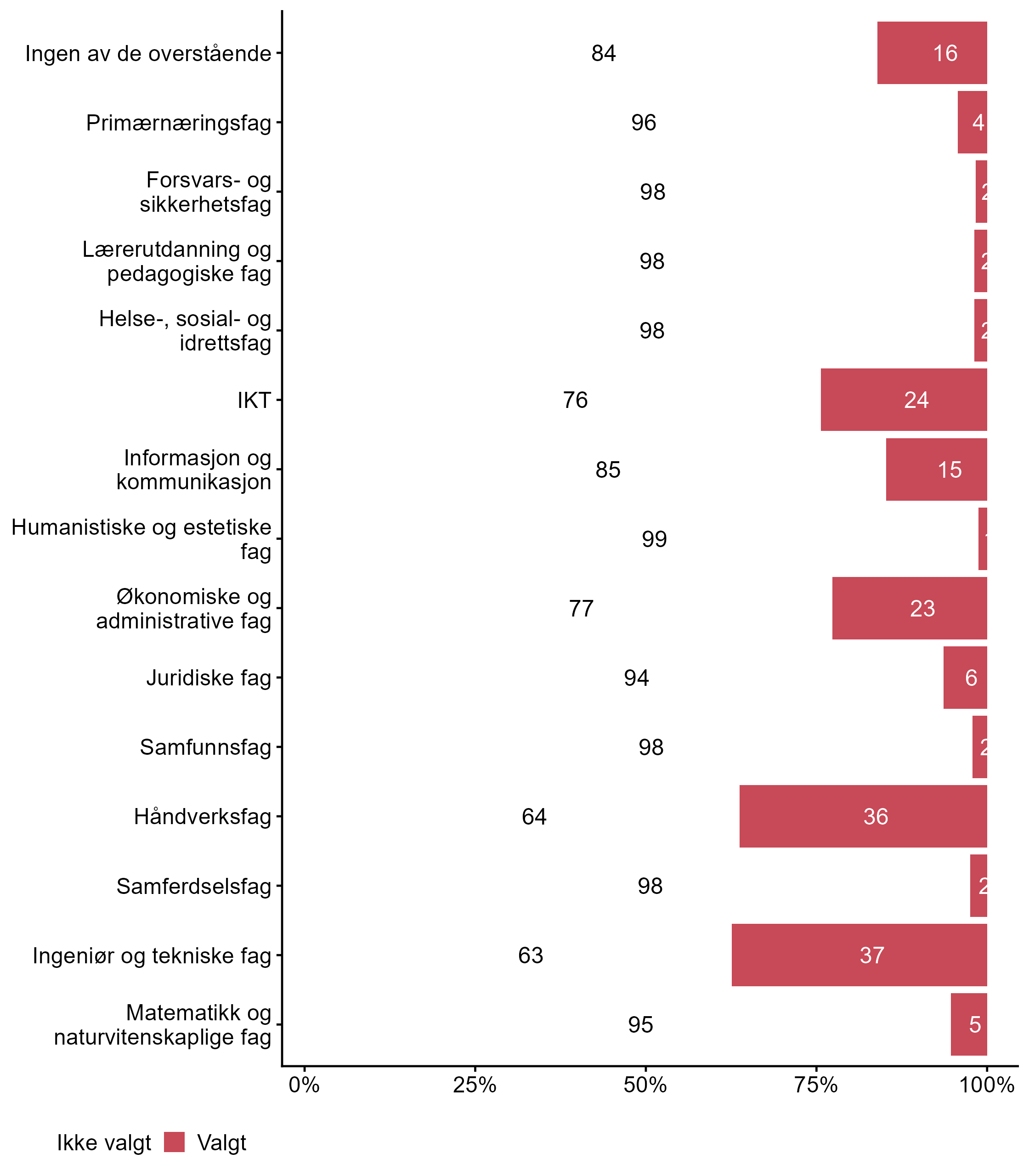 For påstanden Ingeniør og tekniske fag var det færre som svarte Valgt i målgruppen (0,09) enn blant andre (0,37). Færre respondenter svarte Valgt for Håndverksfag i målgruppen (0,04) enn i andre grupper (0,36). For påstanden Helse-, sosial- og idrettsfag var det flere som svarte Valgt i målgruppen (0,43) enn blant andre (0,02). For påstanden Lærerutdanning og pedagogiske fag var det flere som svarte Valgt i målgruppen (0,25) enn blant andre (0,02).