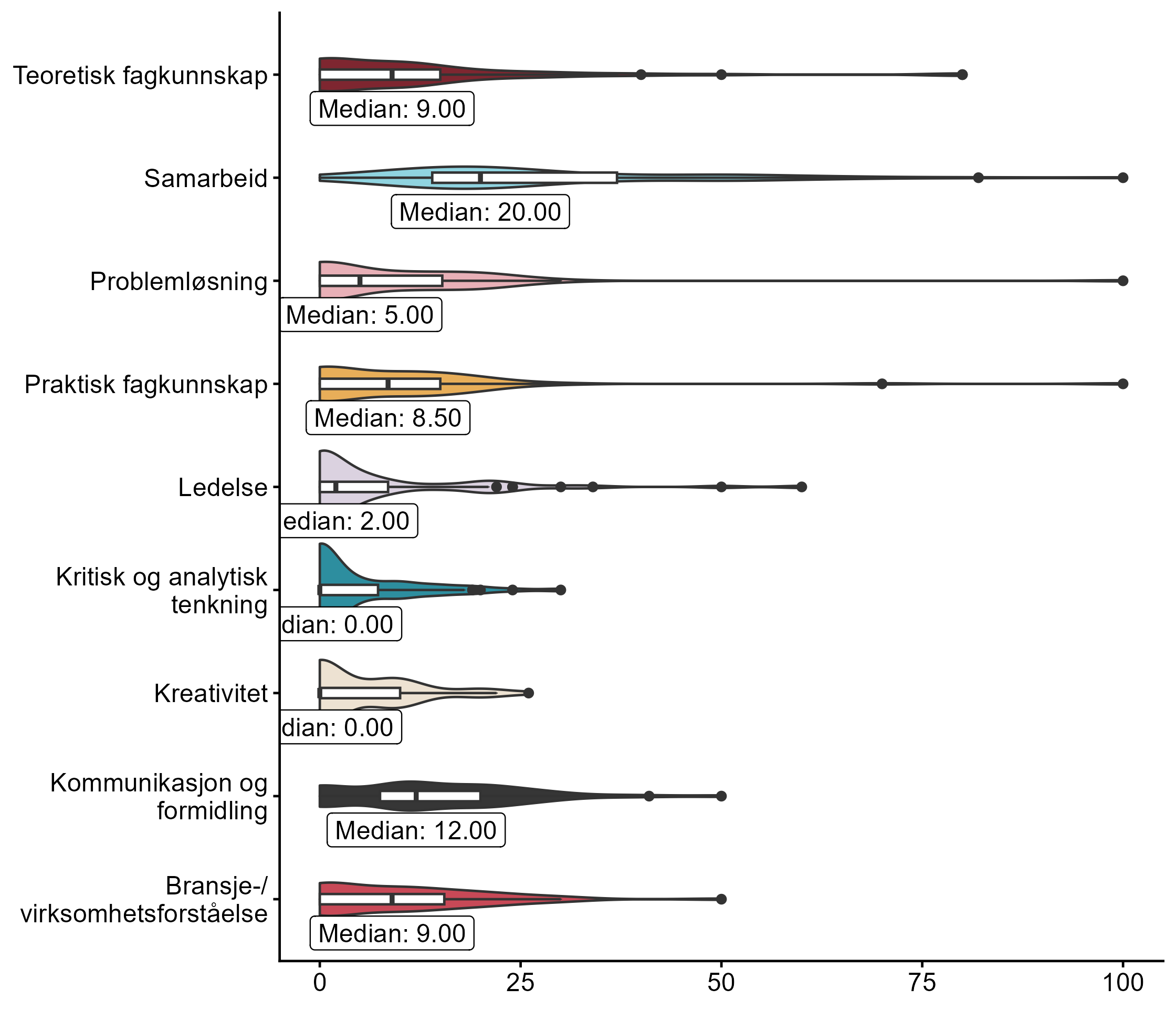 Vi ba også bedriftene se for seg at de skulle ansette en person de neste tre månedene, og ba dem rangere ulike egenskaper, der de ga mest poeng til egenskapene de anså som viktigst i vurdering av søkere. Fordelingen vises i figur 5.