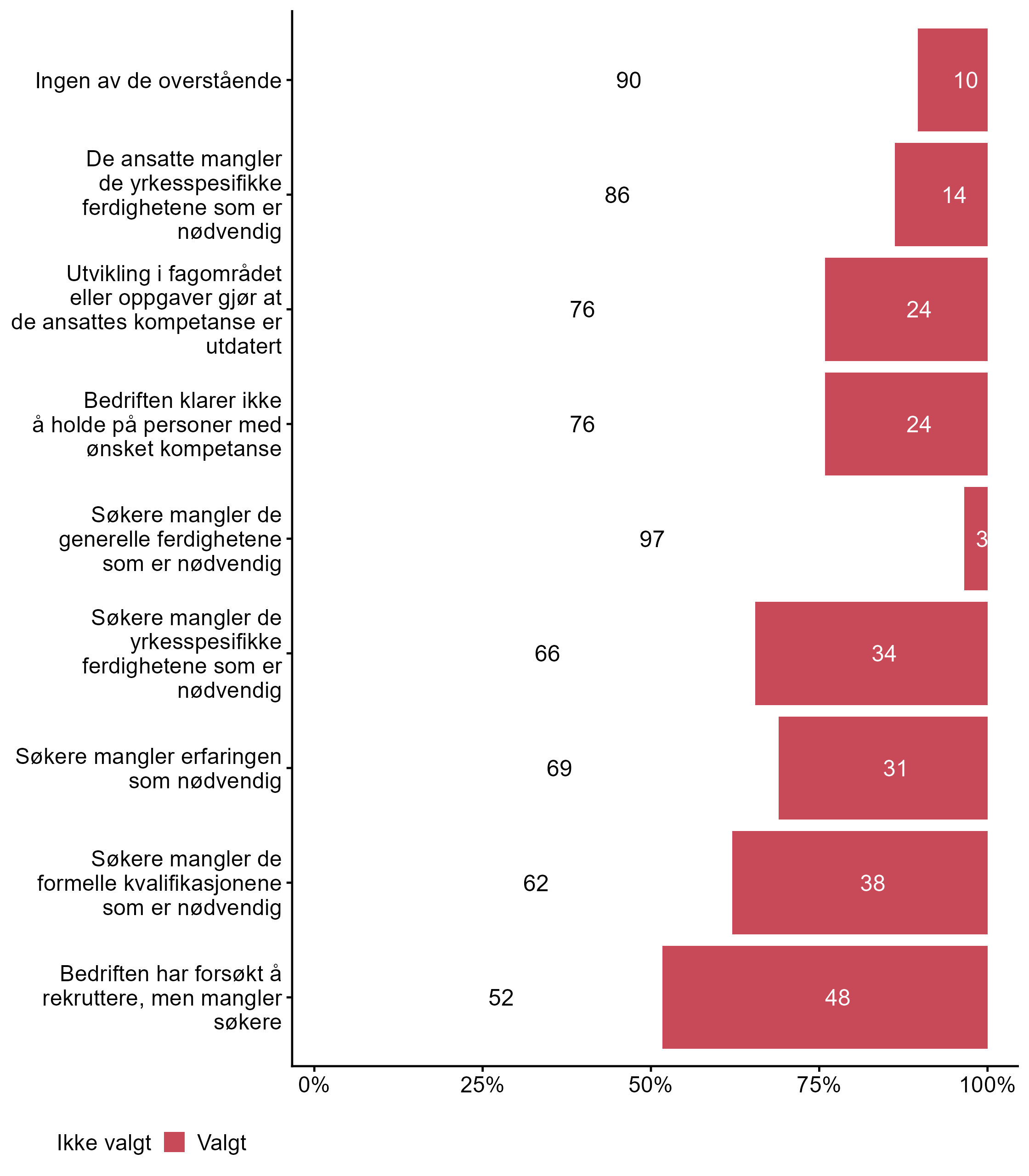 Færre respondenter svarte Valgt for Søkere mangler erfaringen som nødvendig i målgruppen (0,31) enn i andre grupper (0,42). Færre respondenter svarte Valgt for Søkere mangler de generelle ferdighetene som er nødvendig i målgruppen (0,03) enn i andre grupper (0,18). Flere respondenter svarte Valgt på Utvikling i fagområdet eller oppgaver gjør at de ansattes kompetanse er utdatert i målgruppen (0,24) enn for alle andre (0,14).