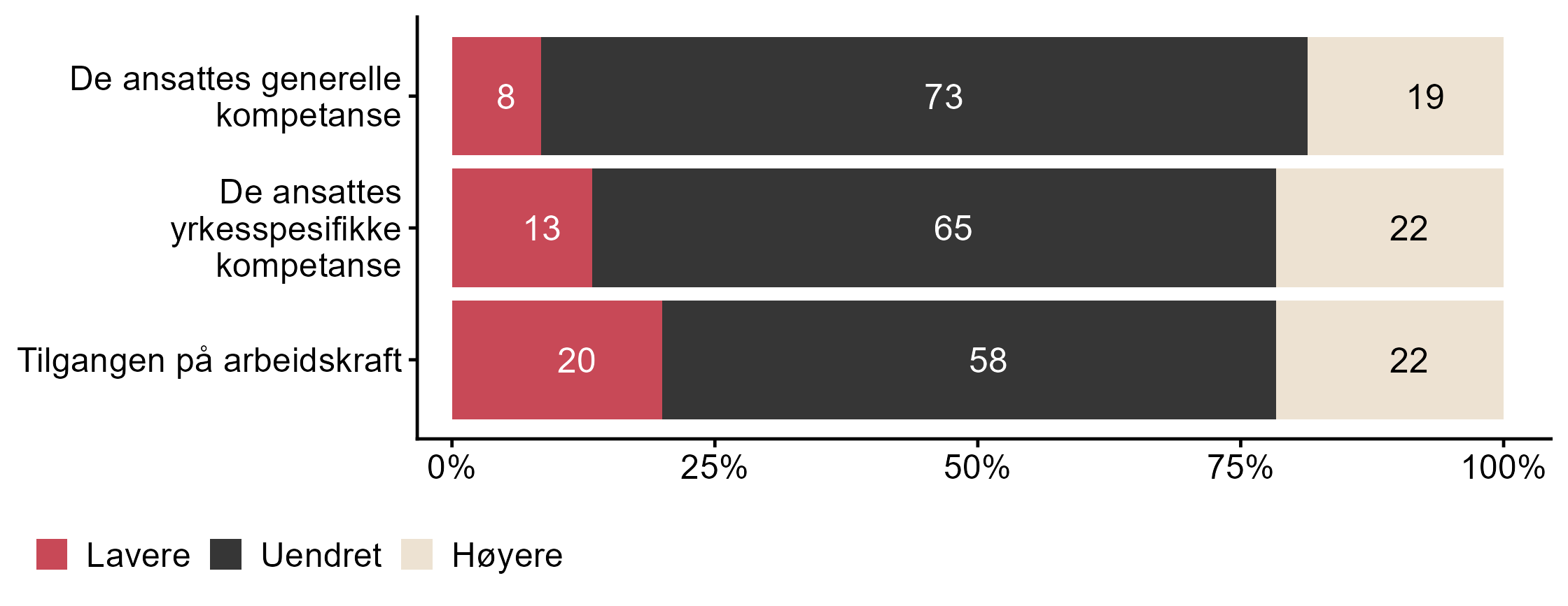I dette kapittelet kan du sammenligne NHO Geneo med andre bedrifters svar på spørsmål om endring i kompetansebehov. Dette inkluderer om det udekte kompetansebehovet har blitt høyere, lavere eller uendret de siste tolv månedene, og spørsmål om hvilke områder som i størst grad har påvirket kompetansebehovet til bedriften. Resultatene vises i figur 1 og figur 2