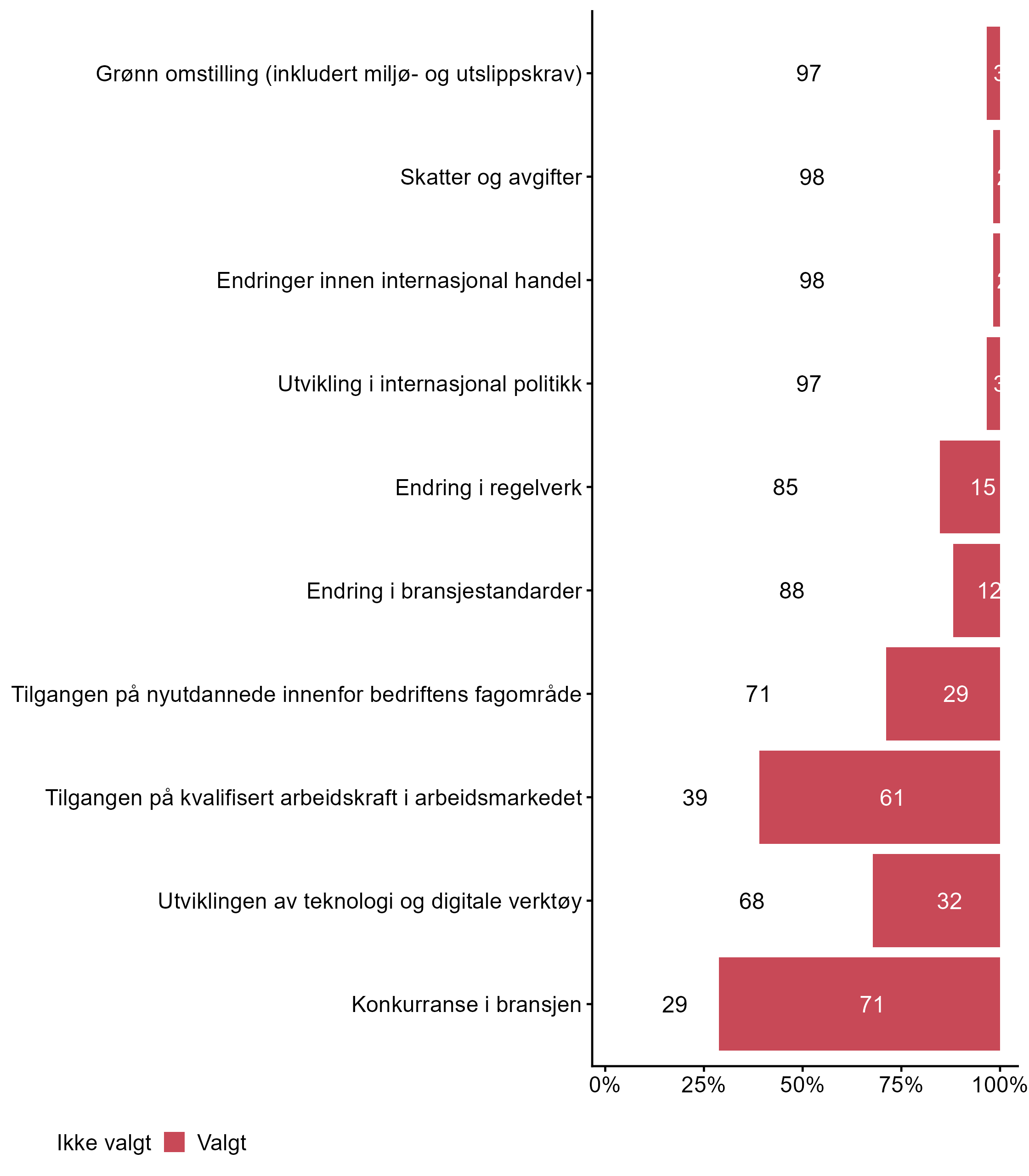 For påstanden _ Konkurranse i bransjen_ var det flere som svarte Valgt i målgruppen (0,71) enn blant andre (0,55). For _ Utviklingen av teknologi og digitale verktøy_ har målgruppen en lavere andel respondenter (0,32) enn alle andre (0,43) som svarte Valgt. Færre respondenter svarte Valgt for _ Grønn omstilling (inkludert miljø- og utslippskrav)_ i målgruppen (0,03) enn i andre grupper (0,15).