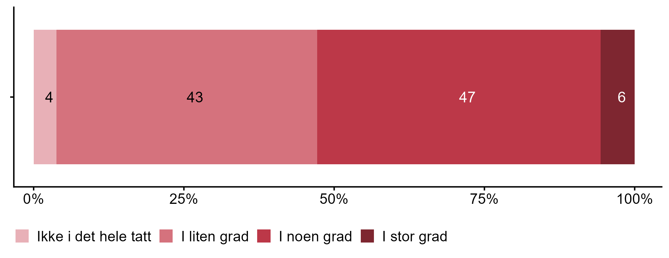 Vi spurte bedriftene i hvilken grad de hadde et udekket kompetansebehov i dag, i figur 1 viser vi svarfordelingen generelt for NHO Logistikk og Transport med resten av utvalget.