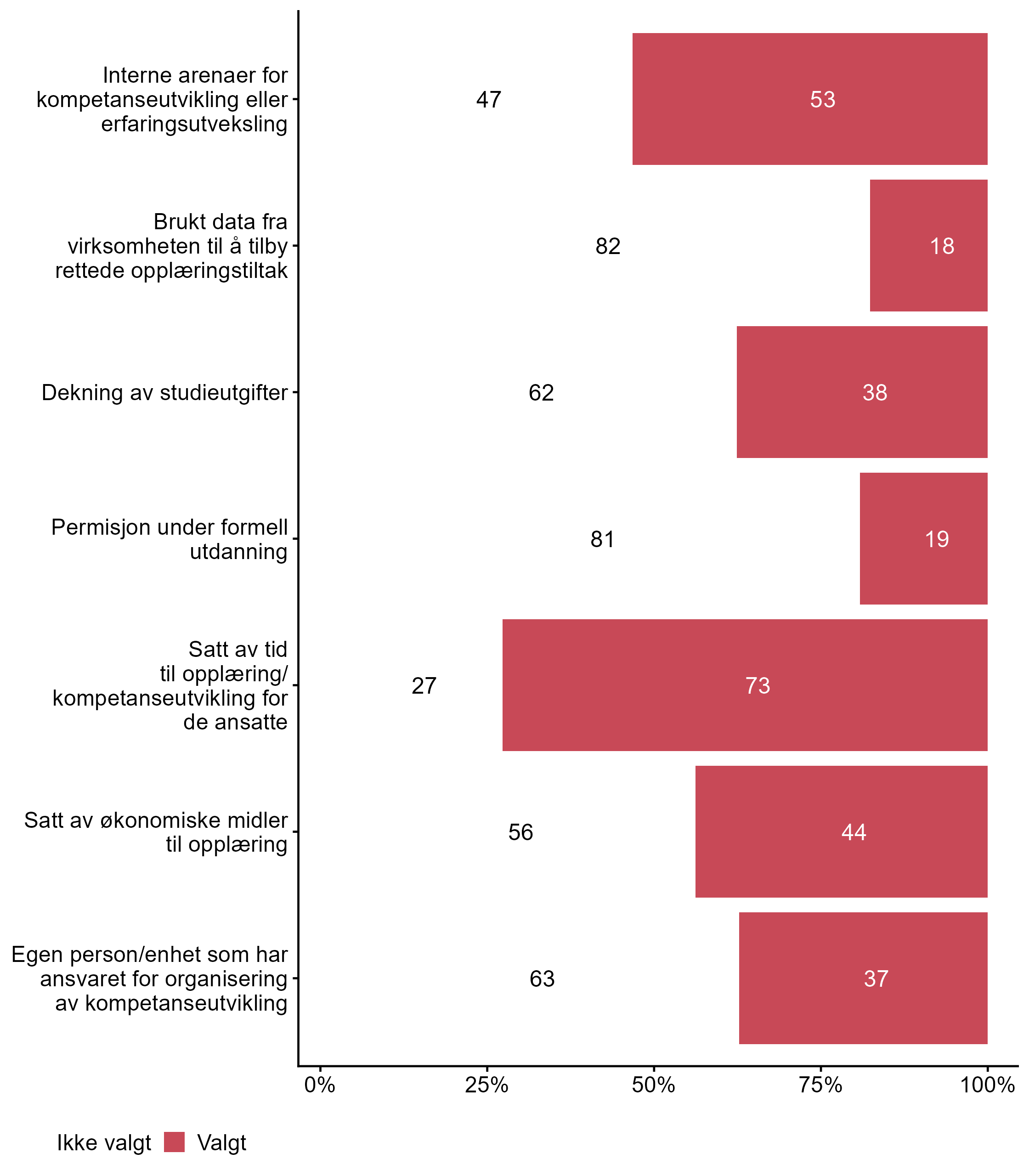 Vi stilte også spørsmål om hvilke tiltak bedriften har hatt for kompetanseutvikling det siste året, svarfordelingen vises i figur 2.