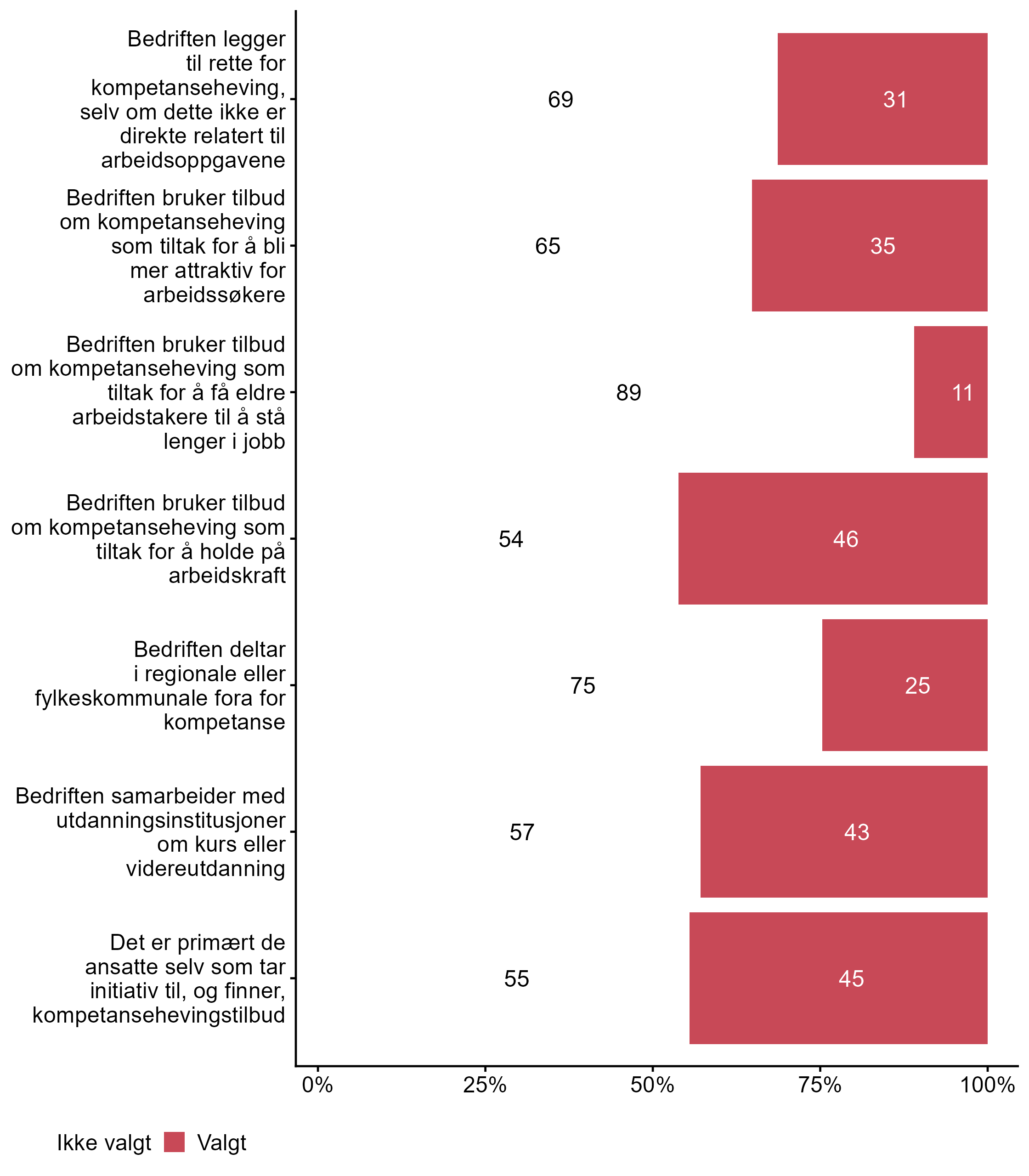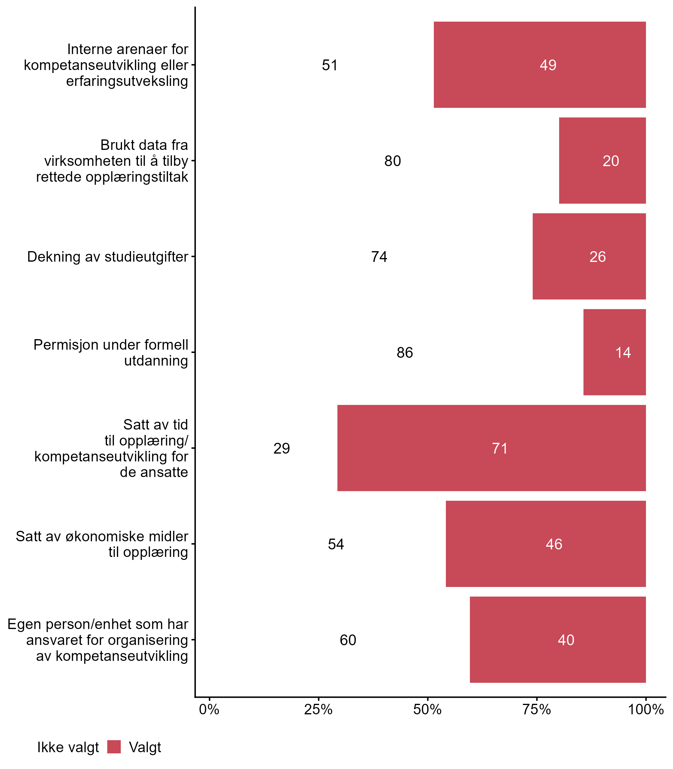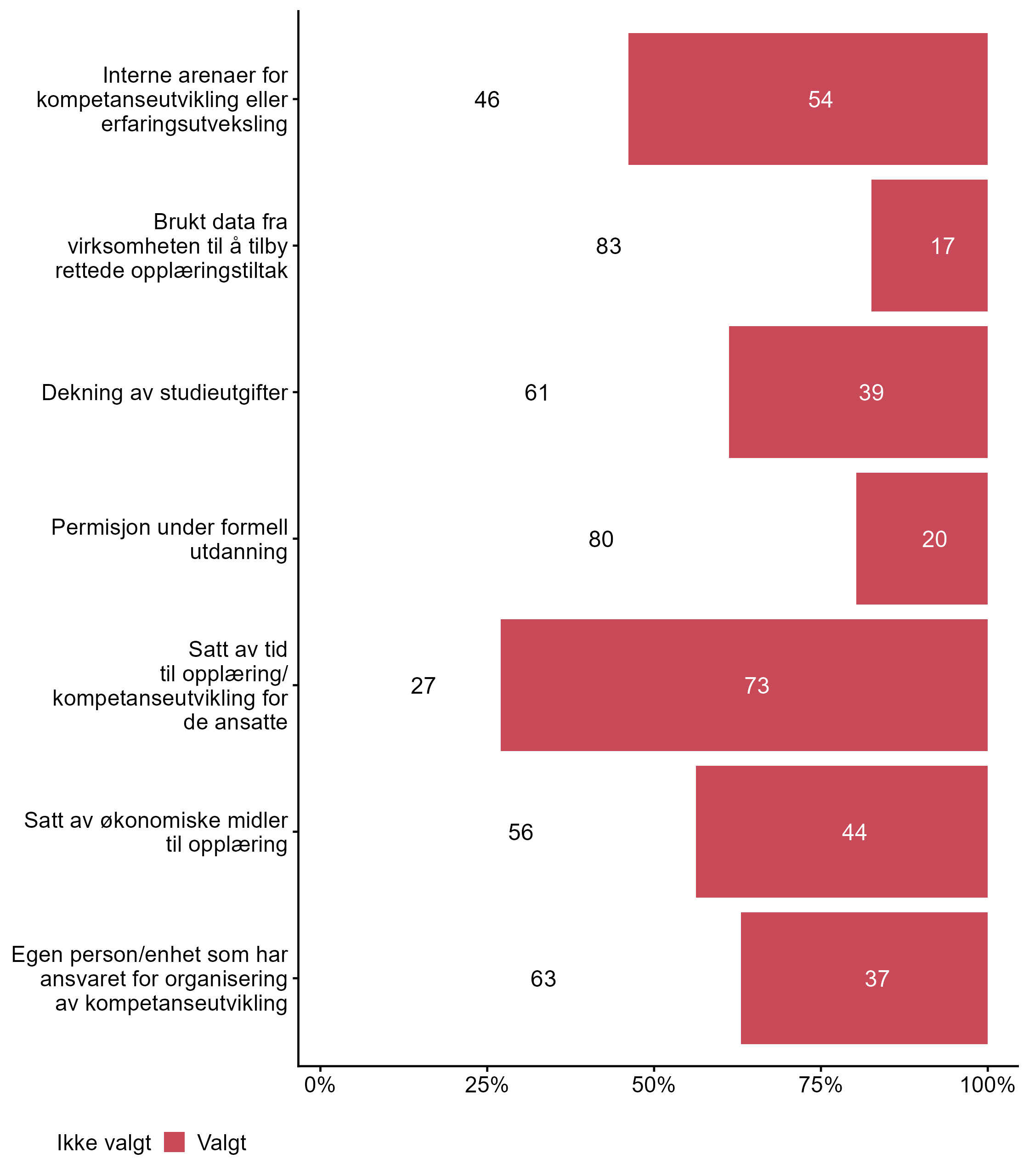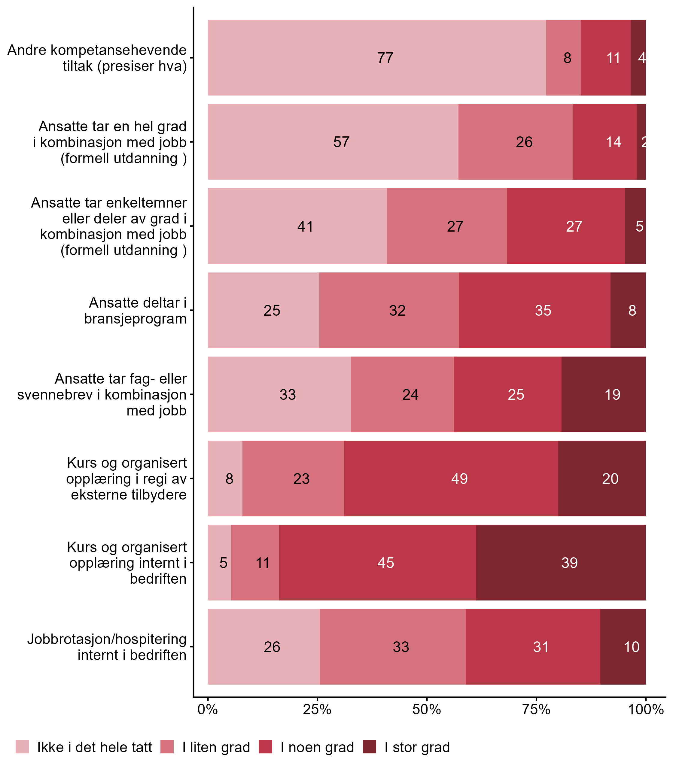Vi stilte også spørsmål om hvilke tiltak bedriften har hatt for kompetanseutvikling det siste året, svarfordelingen vises i figur 2.