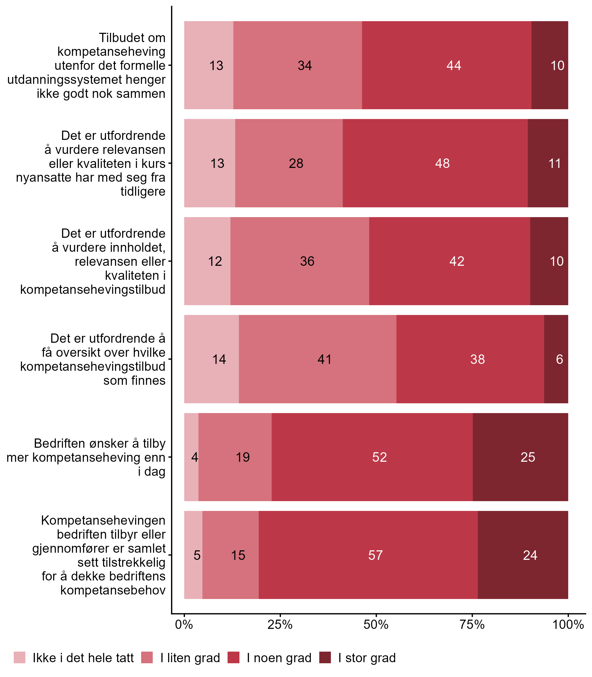 I figur 3 viser vi fordelingen av svar på en rekke påstander knyttet til utfordringer i etter- og videreutdanning.