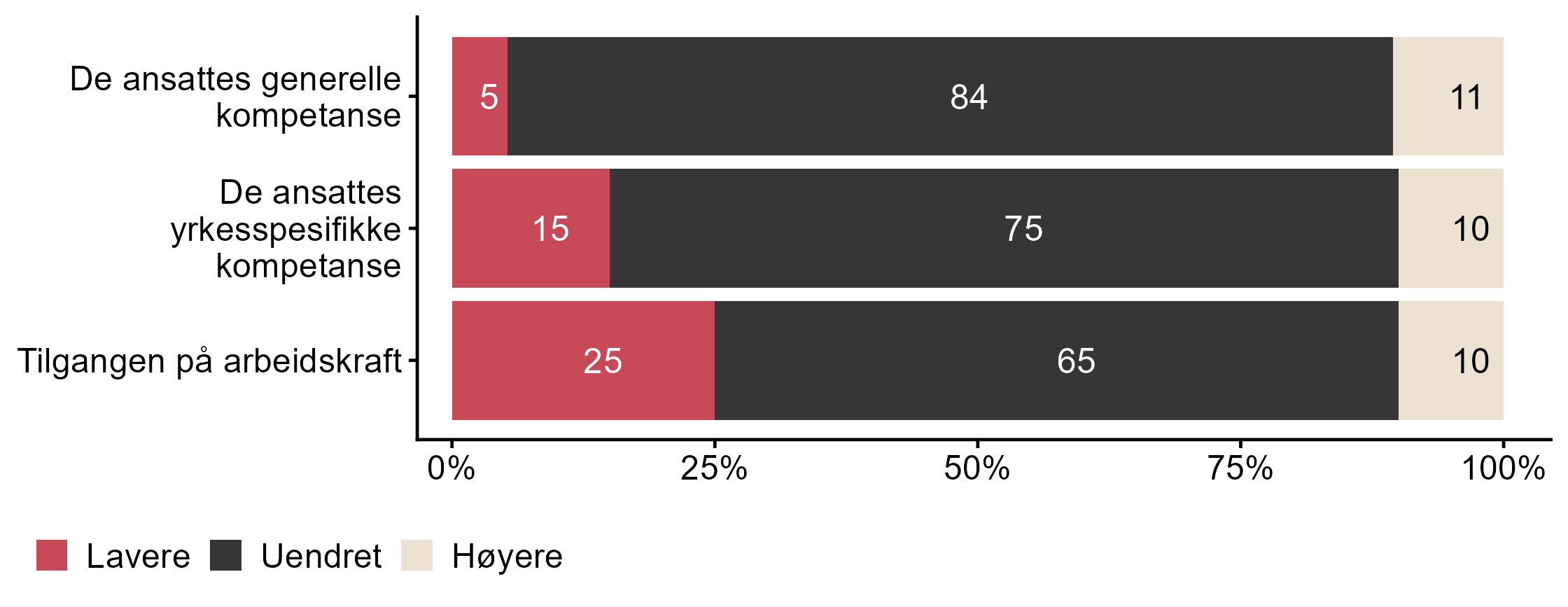 For Tilgangen på arbeidskraft har målgruppen en lavere andel respondenter (0,75) enn alle andre (0,86) som svarte Uendret eller Høyere.