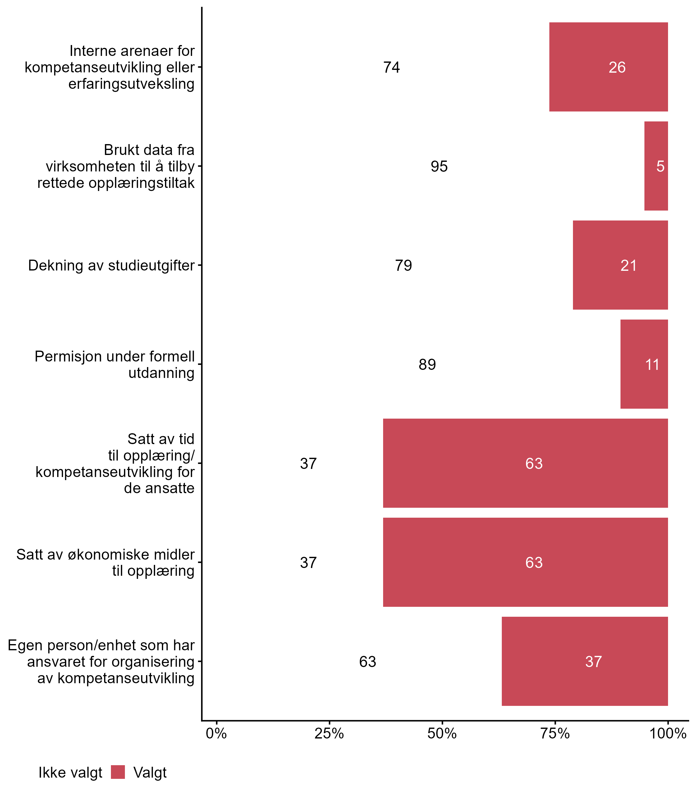 Vi stilte også spørsmål om hvilke tiltak bedriften har hatt for kompetanseutvikling det siste året, svarfordelingen vises i figur 2.