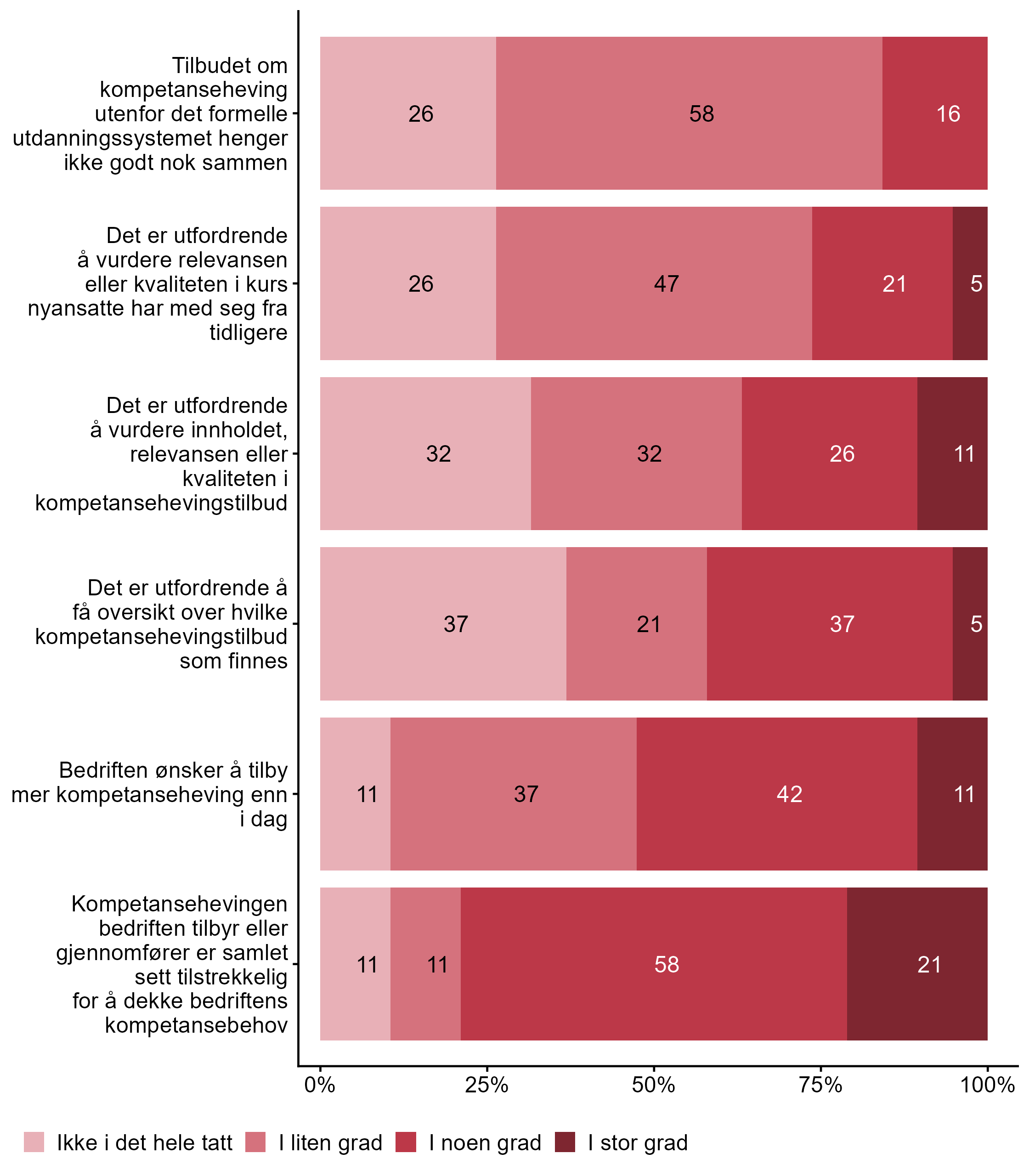 I figur 3 viser vi fordelingen av svar på en rekke påstander knyttet til utfordringer i etter- og videreutdanning.