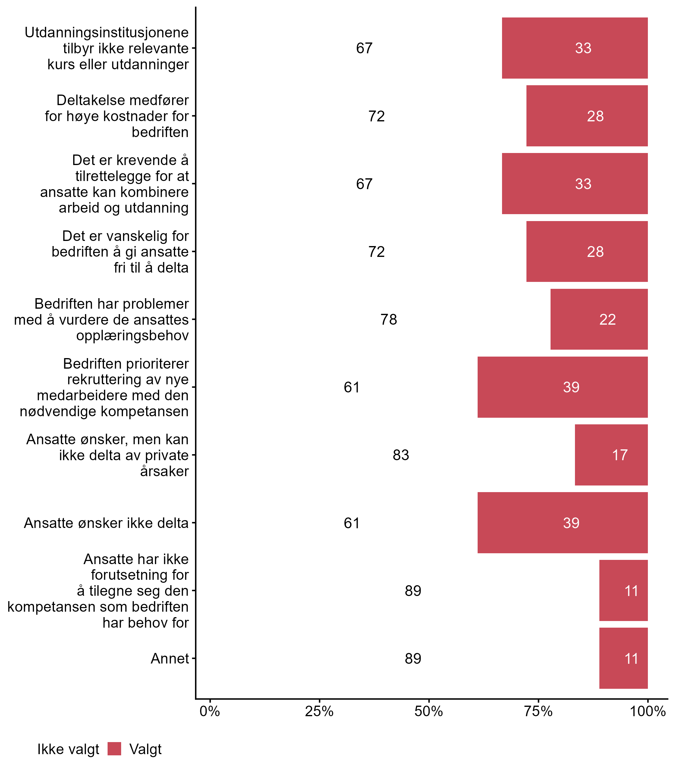 For Bedriften prioriterer rekruttering av nye medarbeidere med den nødvendige kompetansen har målgruppen en høyere andel respondenter (0,39) enn alle andre (0,24) som svarte Valgt. For påstanden Bedriften har problemer med å vurdere de ansattes opplæringsbehov var det flere som svarte Valgt i målgruppen (0,22) enn blant andre (0,09). For påstanden Utdanningsinstitusjonene tilbyr ikke relevante kurs eller utdanninger var det flere som svarte Valgt i målgruppen (0,33) enn blant andre (0,18).