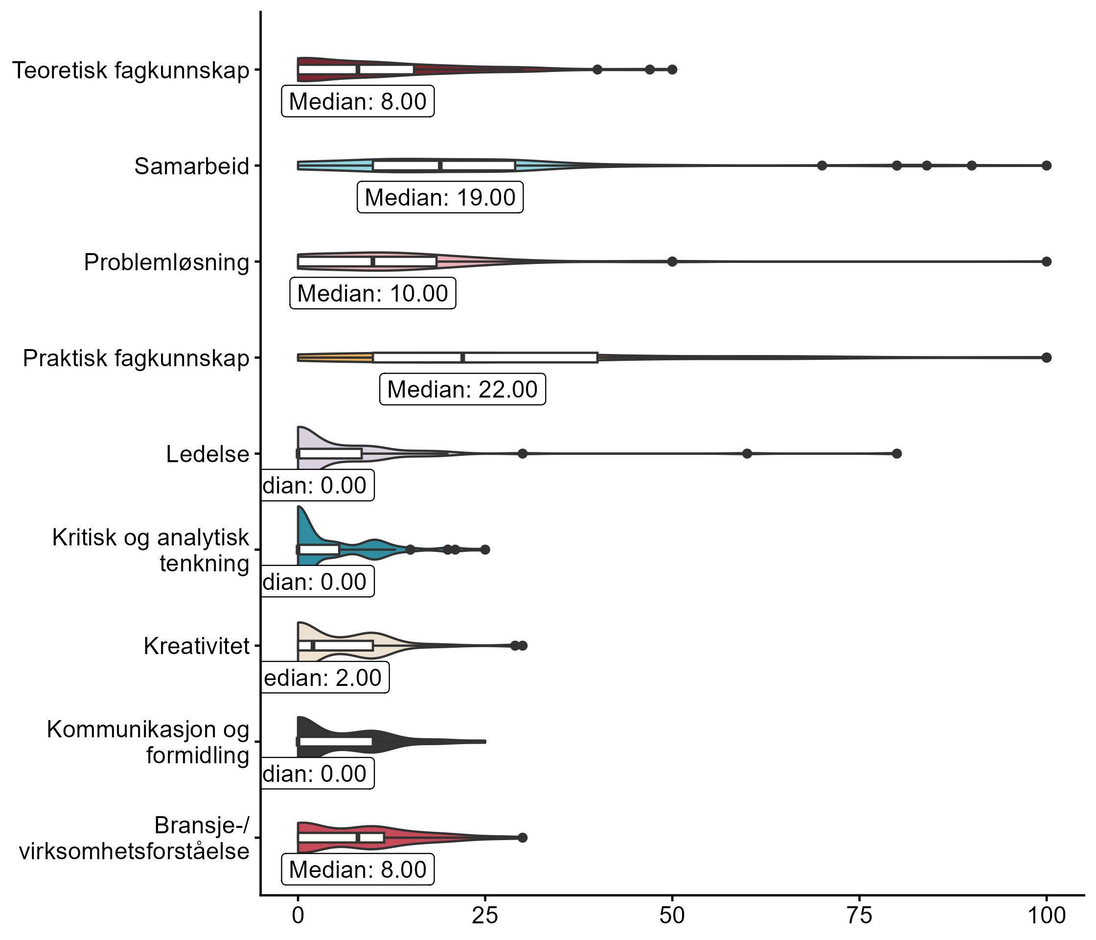 Vi ba også bedriftene se for seg at de skulle ansette en person de neste tre månedene, og ba dem rangere ulike egenskaper, der de ga mest poeng til egenskapene de anså som viktigst i vurdering av søkere. Fordelingen vises i figur 5.