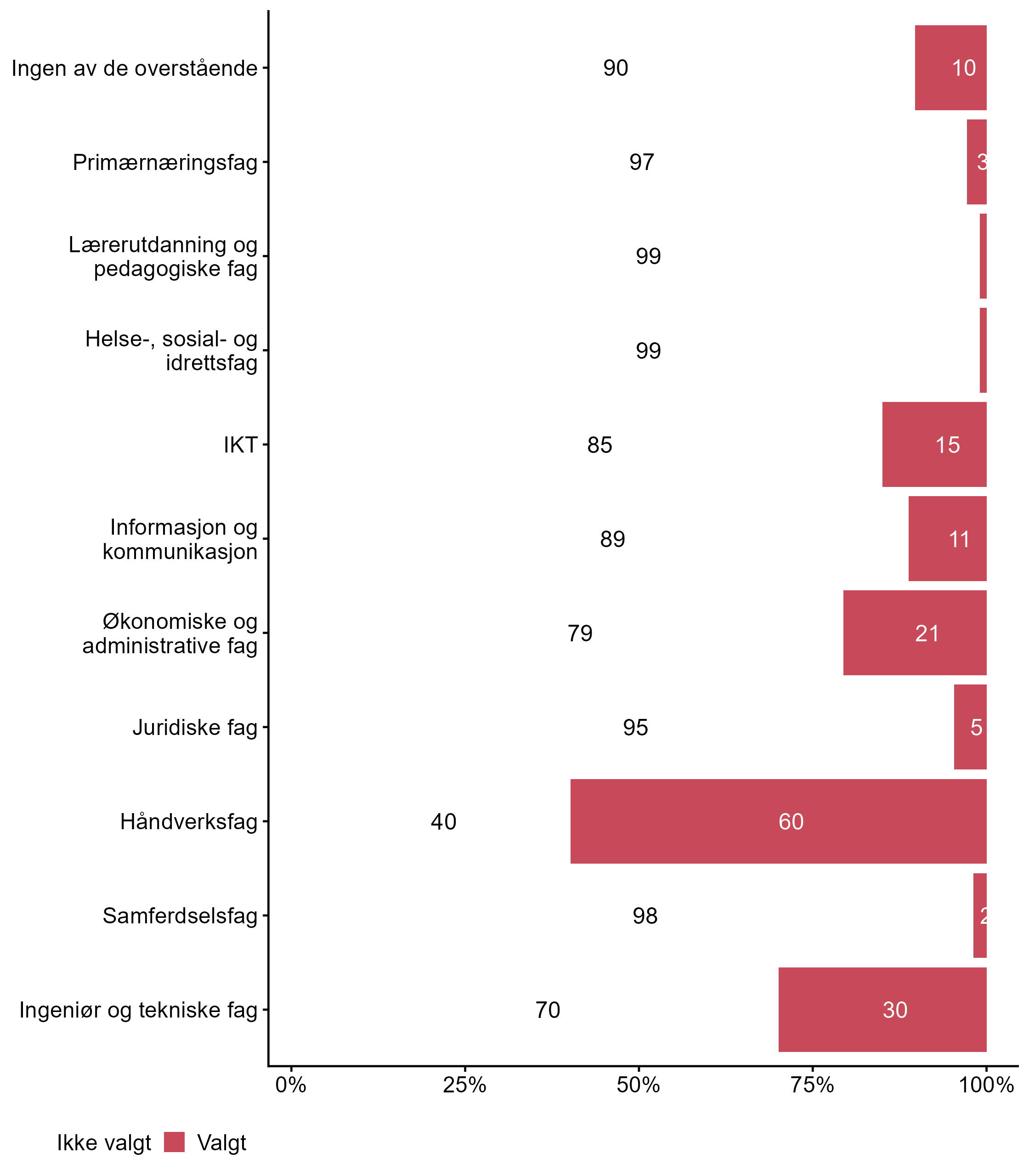 For Håndverksfag har målgruppen en høyere andel respondenter (0,6) enn alle andre (0,34) som svarte Valgt.