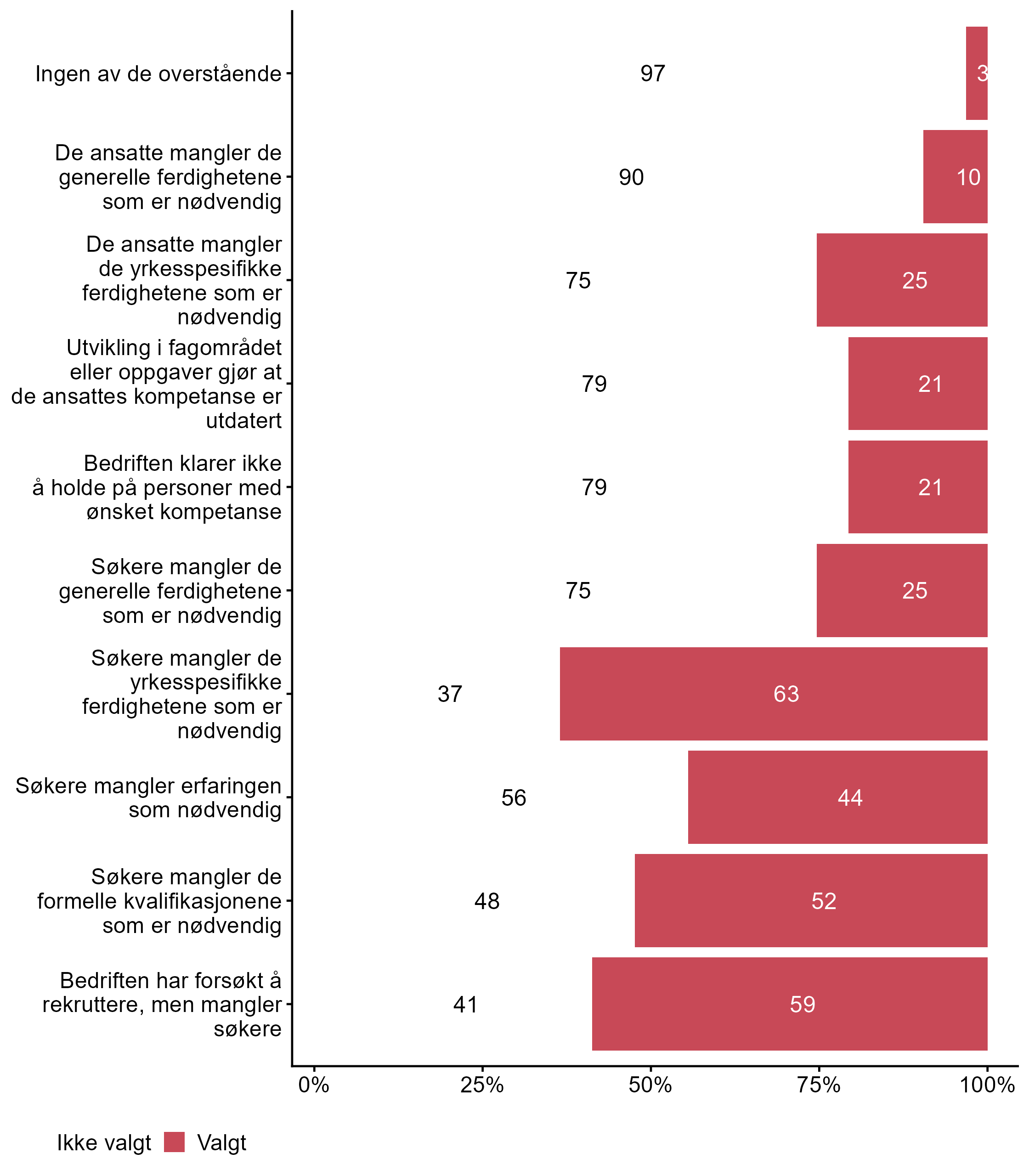 De som svarte “I noen grad” eller “I stor grad” på spørsmål om bedriften har et udekket kompetansebehov i dag, ble spurt om årsaker til og konsekvenser av kompetansebehovet, og ble bedt om å krysse av for det som passer best for bedriften. Svarfordelingen vises i figur 3 og figur 4.