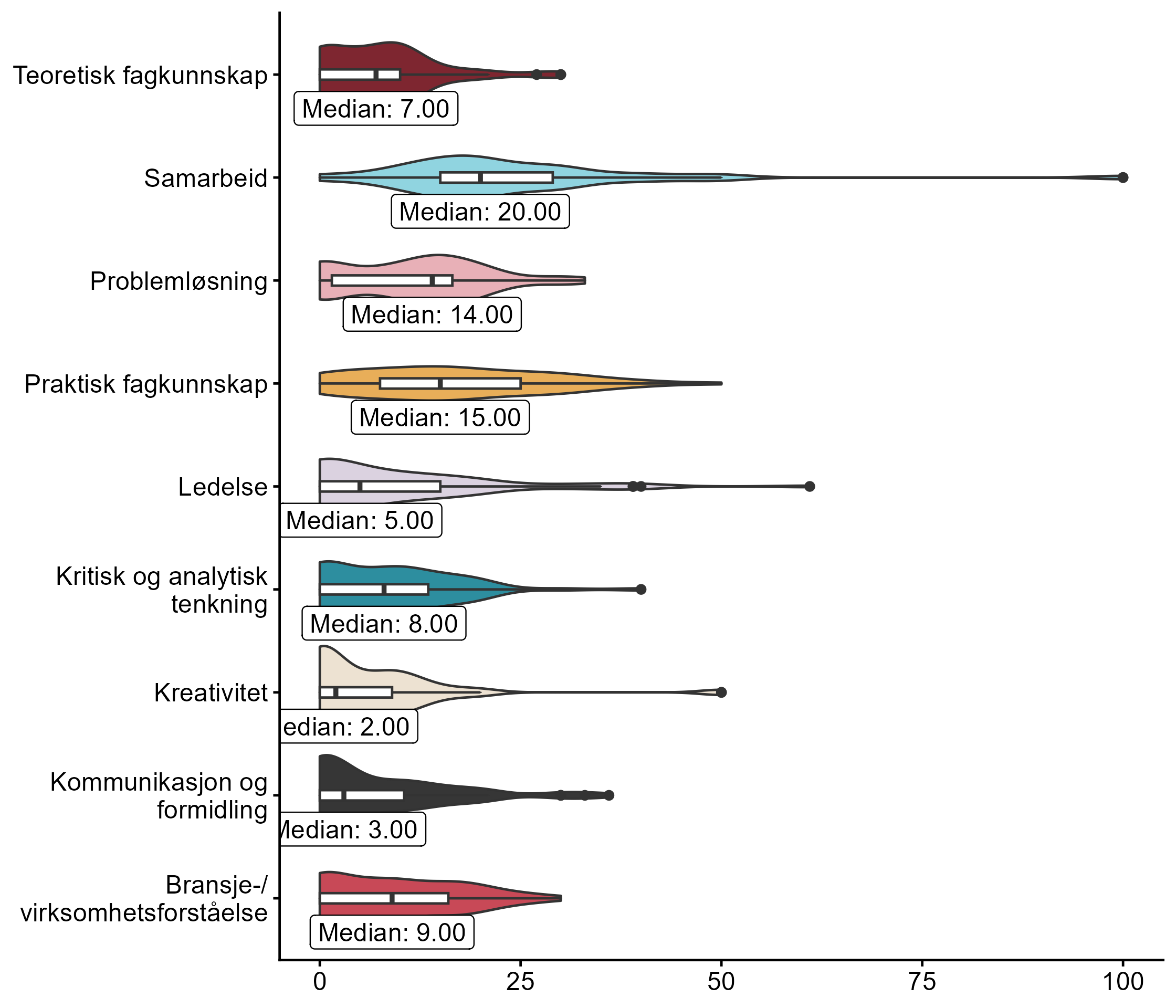 Vi ba også bedriftene se for seg at de skulle ansette en person de neste tre månedene, og ba dem rangere ulike egenskaper, der de ga mest poeng til egenskapene de anså som viktigst i vurdering av søkere. Fordelingen vises i figur 5.