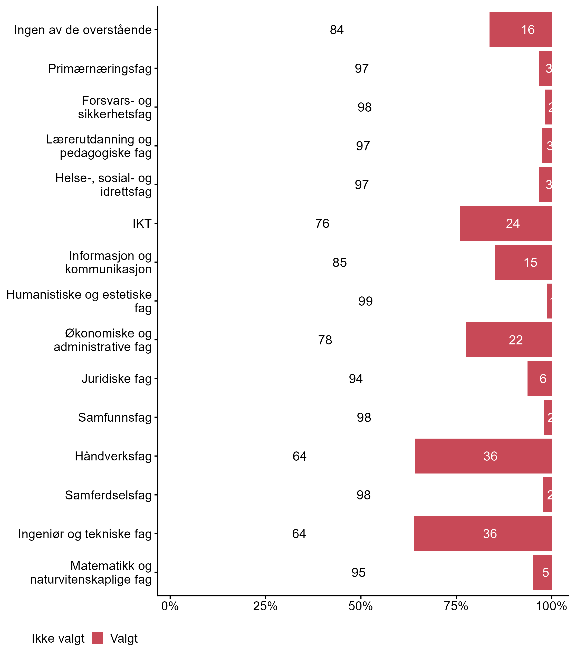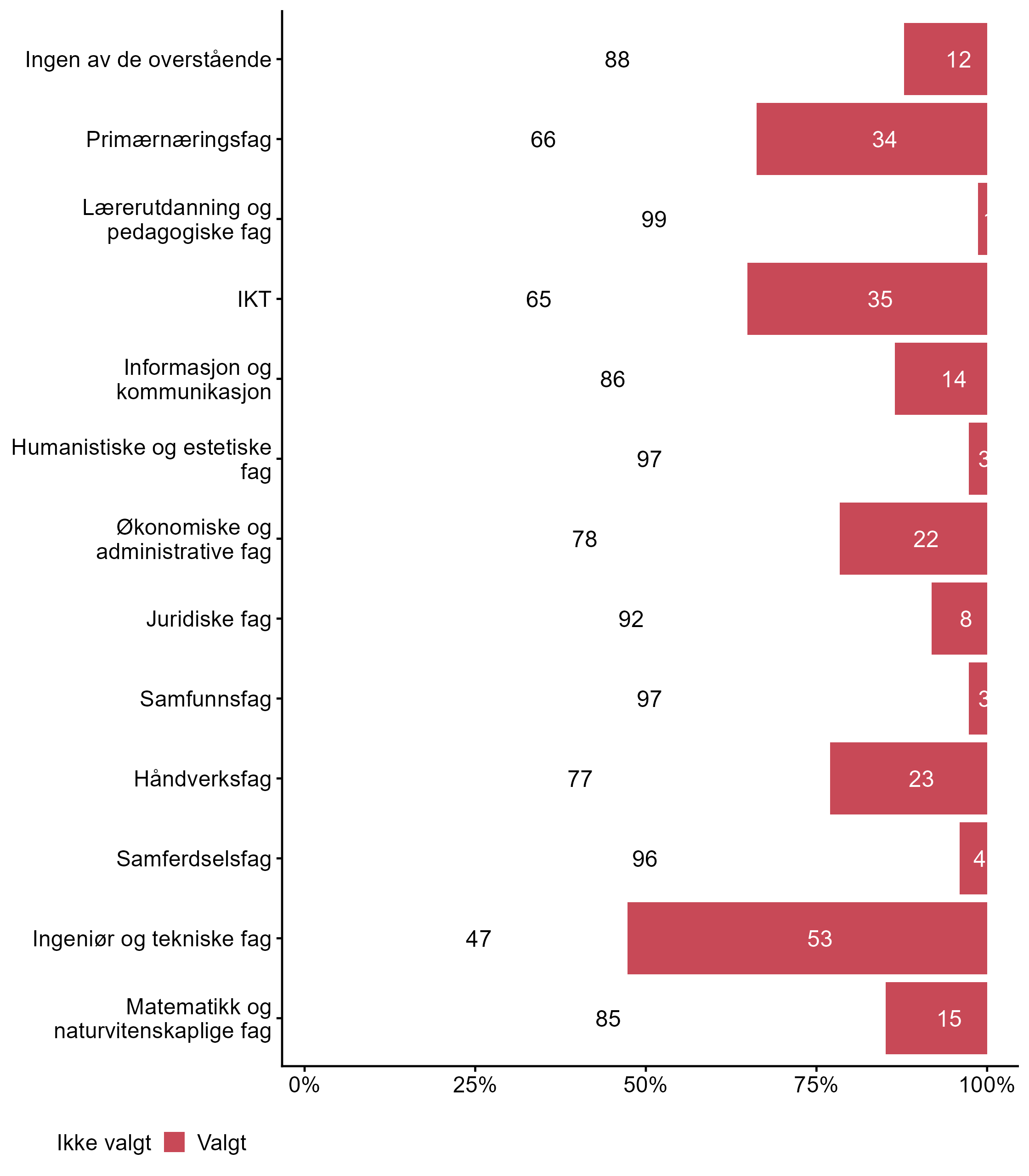 For påstanden Ingeniør og tekniske fag var det flere som svarte Valgt i målgruppen (0,53) enn blant andre (0,36). For Håndverksfag har målgruppen en lavere andel respondenter (0,23) enn alle andre (0,36) som svarte Valgt. Flere respondenter svarte Valgt på IKT i målgruppen (0,35) enn for alle andre (0,24). For påstanden Primærnæringsfag var det flere som svarte Valgt i målgruppen (0,34) enn blant andre (0,03).