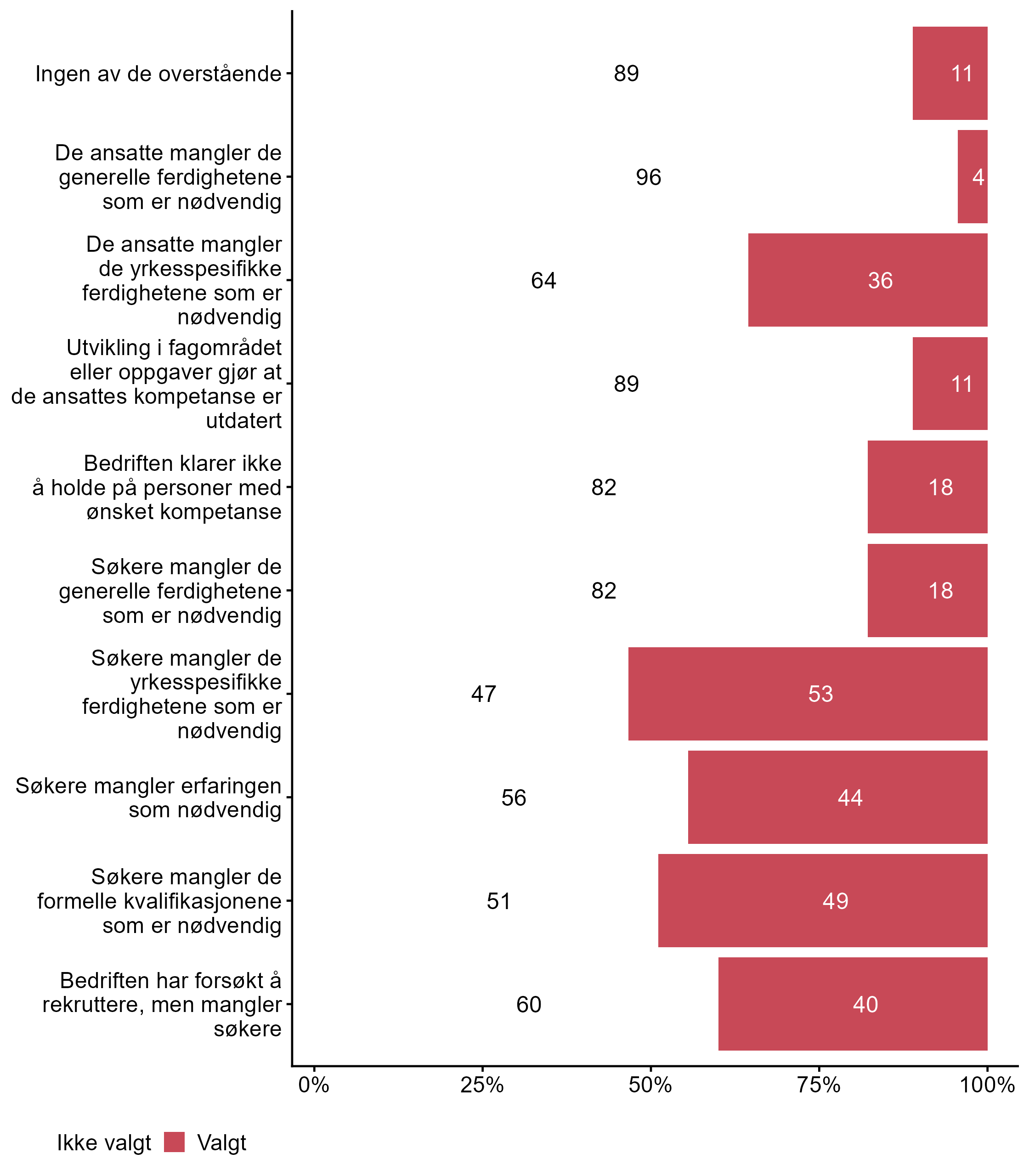 For Søkere mangler de formelle kvalifikasjonene som er nødvendig har målgruppen en høyere andel respondenter (0,49) enn alle andre (0,37) som svarte Valgt. Flere respondenter svarte Valgt på Søkere mangler de yrkesspesifikke ferdighetene som er nødvendig i målgruppen (0,53) enn for alle andre (0,42). Flere respondenter svarte Valgt på De ansatte mangler de yrkesspesifikke ferdighetene som er nødvendig i målgruppen (0,36) enn for alle andre (0,21).
