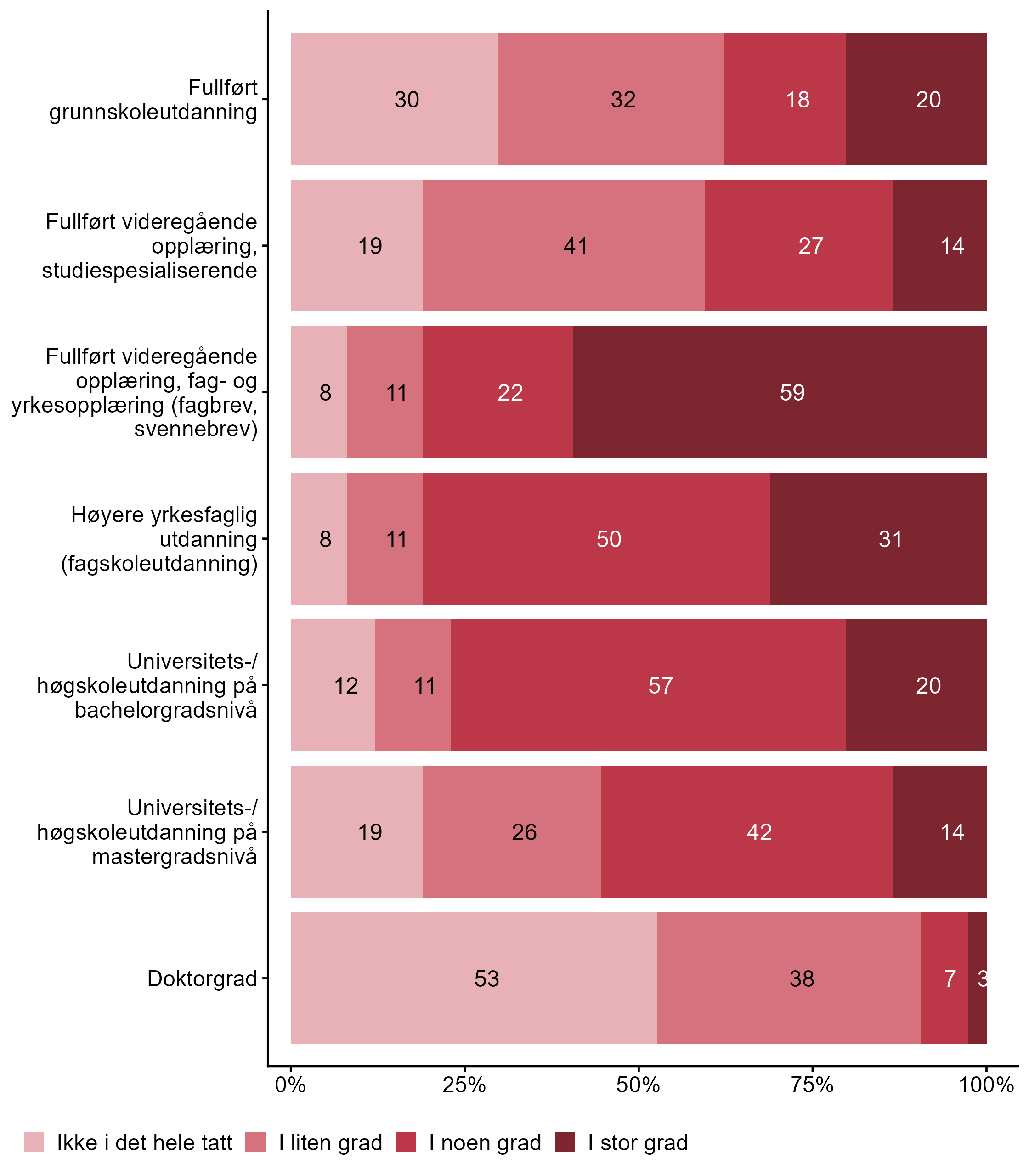 For Universitets-/høgskoleutdanning på mastergradsnivå har målgruppen en høyere andel respondenter (0,55) enn alle andre (0,4) som svarte I noen grad eller I stor grad. Flere respondenter svarte I noen grad eller I stor grad på Universitets-/høgskoleutdanning på bachelorgradsnivå i målgruppen (0,77) enn for alle andre (0,56). For Høyere yrkesfaglig utdanning (fagskoleutdanning) har målgruppen en høyere andel respondenter (0,81) enn alle andre (0,63) som svarte I noen grad eller I stor grad.