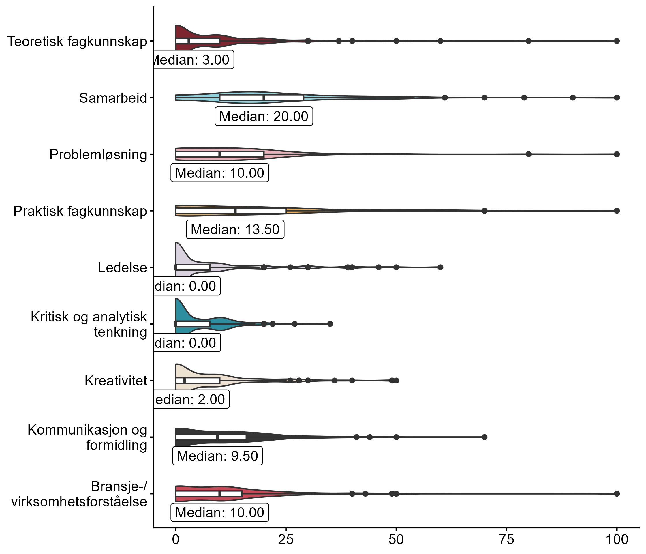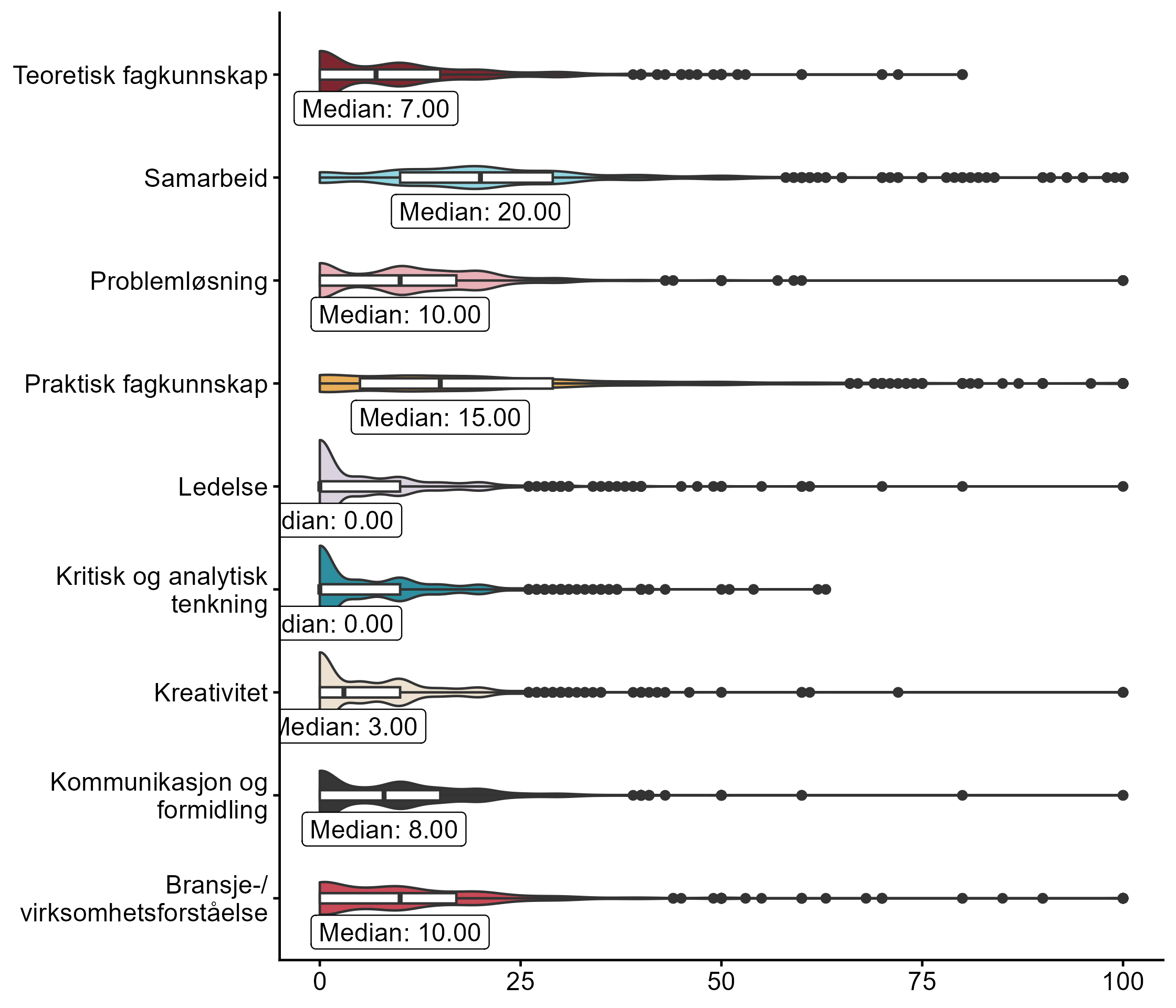 Vi ba også bedriftene se for seg at de skulle ansette en person de neste tre månedene, og ba dem rangere ulike egenskaper, der de ga mest poeng til egenskapene de anså som viktigst i vurdering av søkere. Fordelingen vises i figur 5.