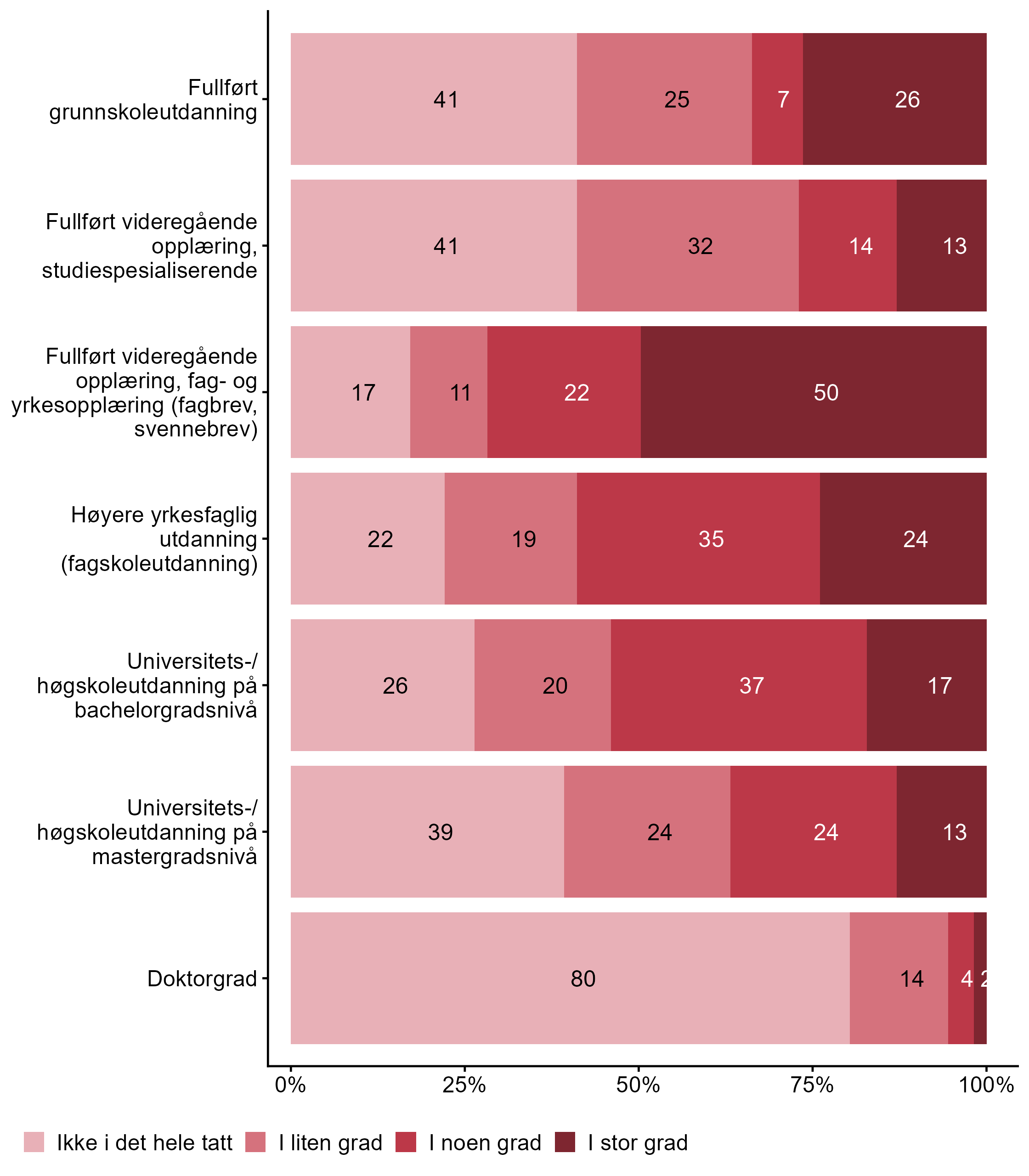 Vi spurte bedriftene hvilke utdanningsnivåer som er relevante for bedriften, og presenterer her i figur 2 overordnet prosentandel av bedriftene som har svart de ulike utdanningsnivåene for hele utvalget.