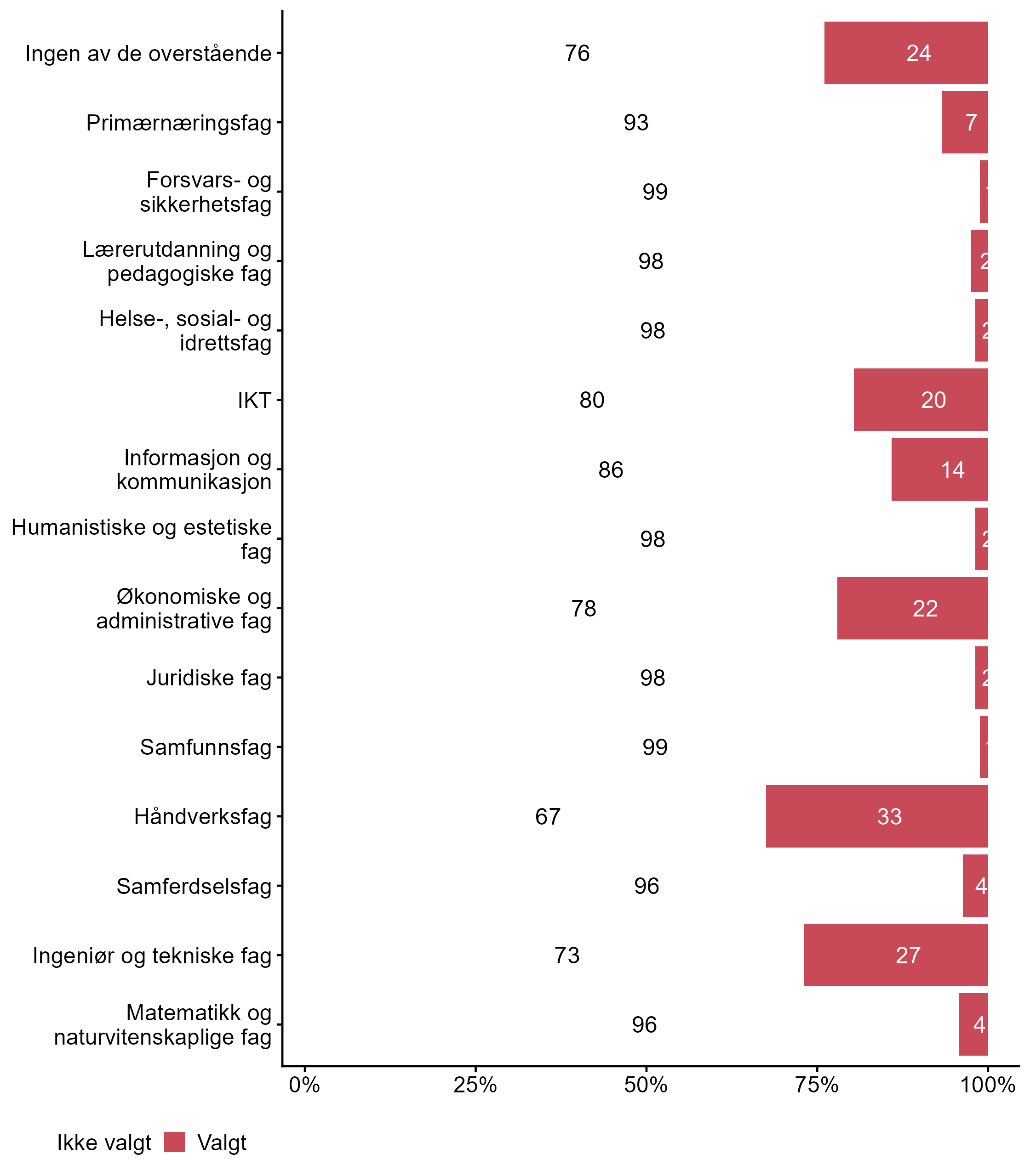 I figur 1 følger prosentandelen av bedriftene som har svart de ulike fagområdene for hele utvalget.