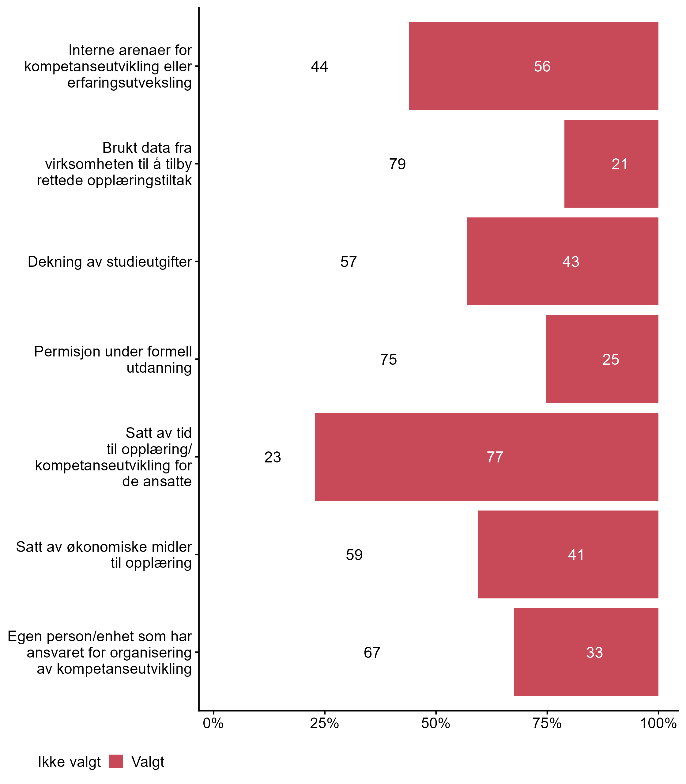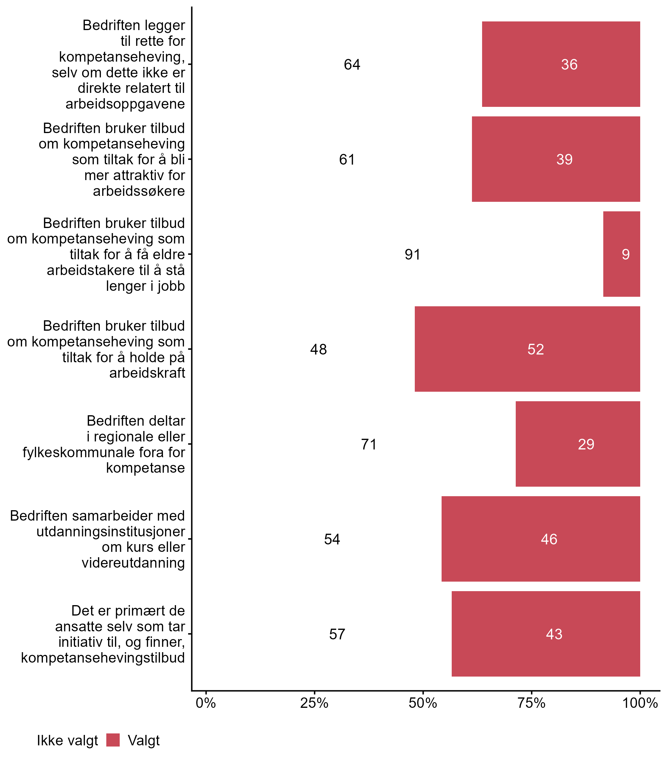 Vi stilte også spørsmål om hvilke tiltak bedriften har hatt for kompetanseutvikling det siste året, svarfordelingen vises i figur 2.