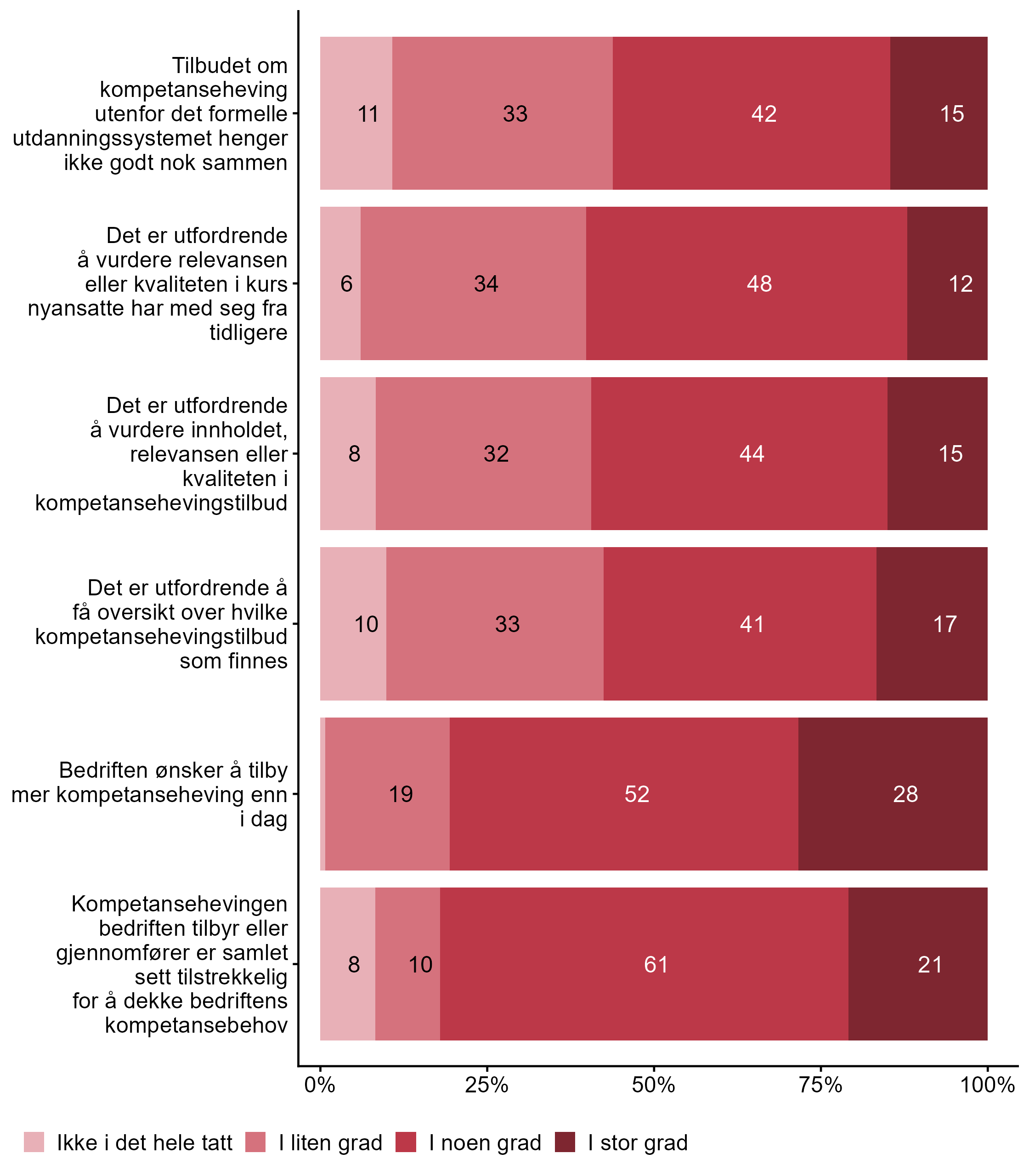 I figur 3 viser vi fordelingen av svar på en rekke påstander knyttet til utfordringer i etter- og videreutdanning.