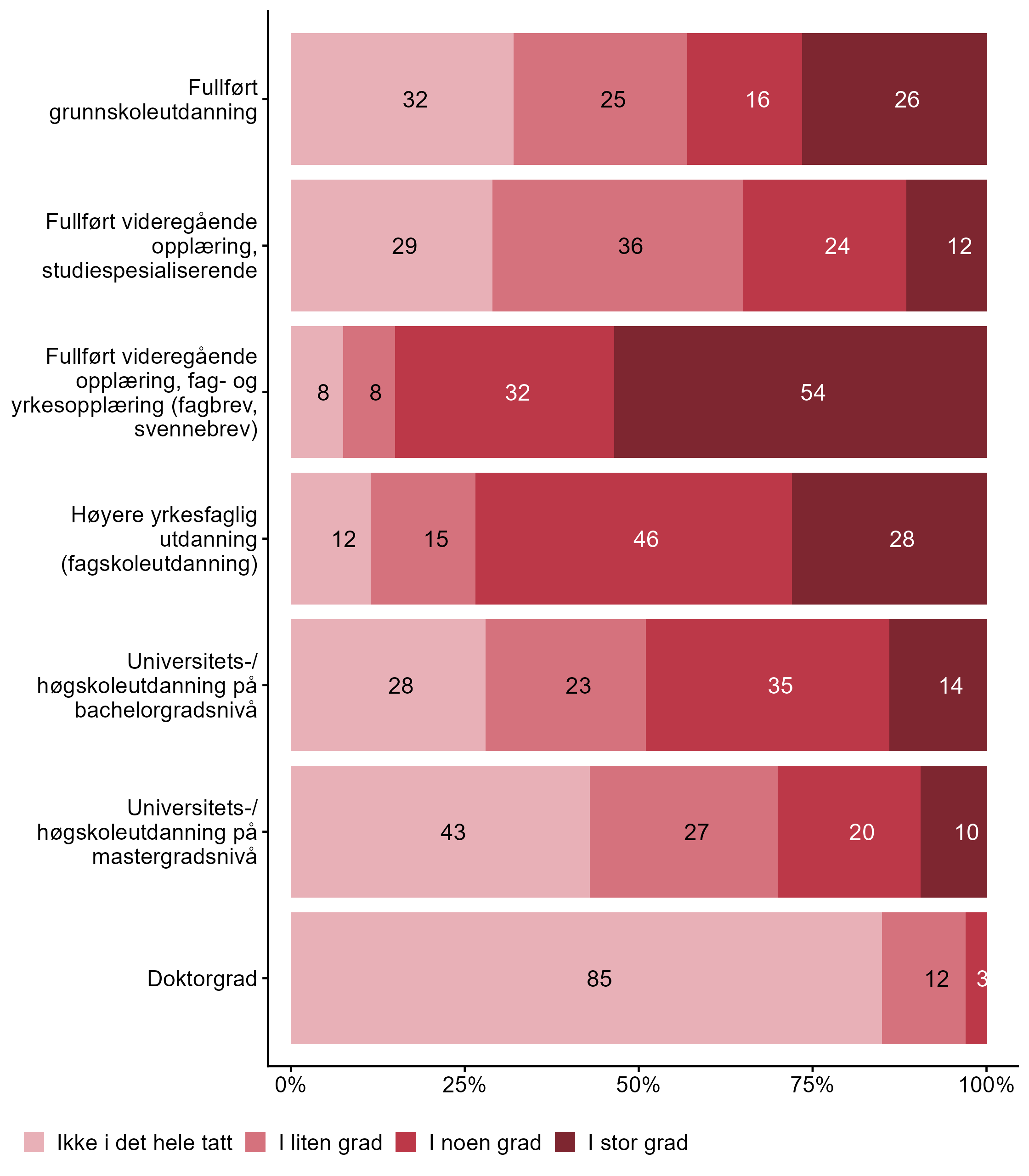For Universitets-/høgskoleutdanning på mastergradsnivå har målgruppen en lavere andel respondenter (0,3) enn alle andre (0,42) som svarte I noen grad eller I stor grad. Flere respondenter svarte I noen grad eller I stor grad på Høyere yrkesfaglig utdanning (fagskoleutdanning) i målgruppen (0,74) enn for alle andre (0,63). For Fullført videregående opplæring, fag- og yrkesopplæring (fagbrev, svennebrev) har målgruppen en høyere andel respondenter (0,85) enn alle andre (0,72) som svarte I noen grad eller I stor grad.