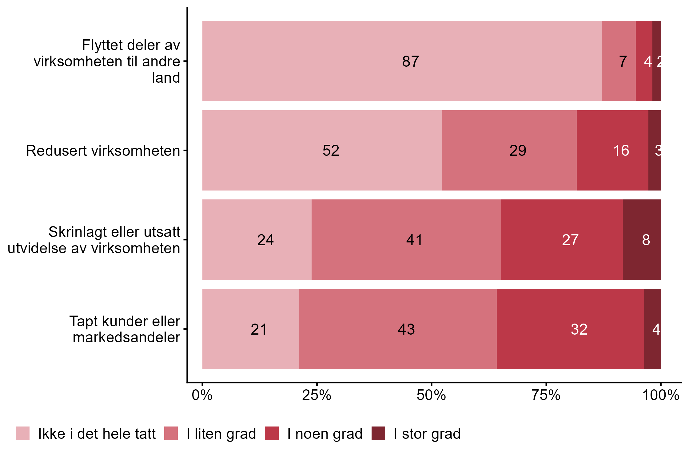 For Skrinlagt eller utsatt utvidelse av virksomheten har målgruppen en lavere andel respondenter (0,35) enn alle andre (0,47) som svarte I noen grad eller I stor grad.
