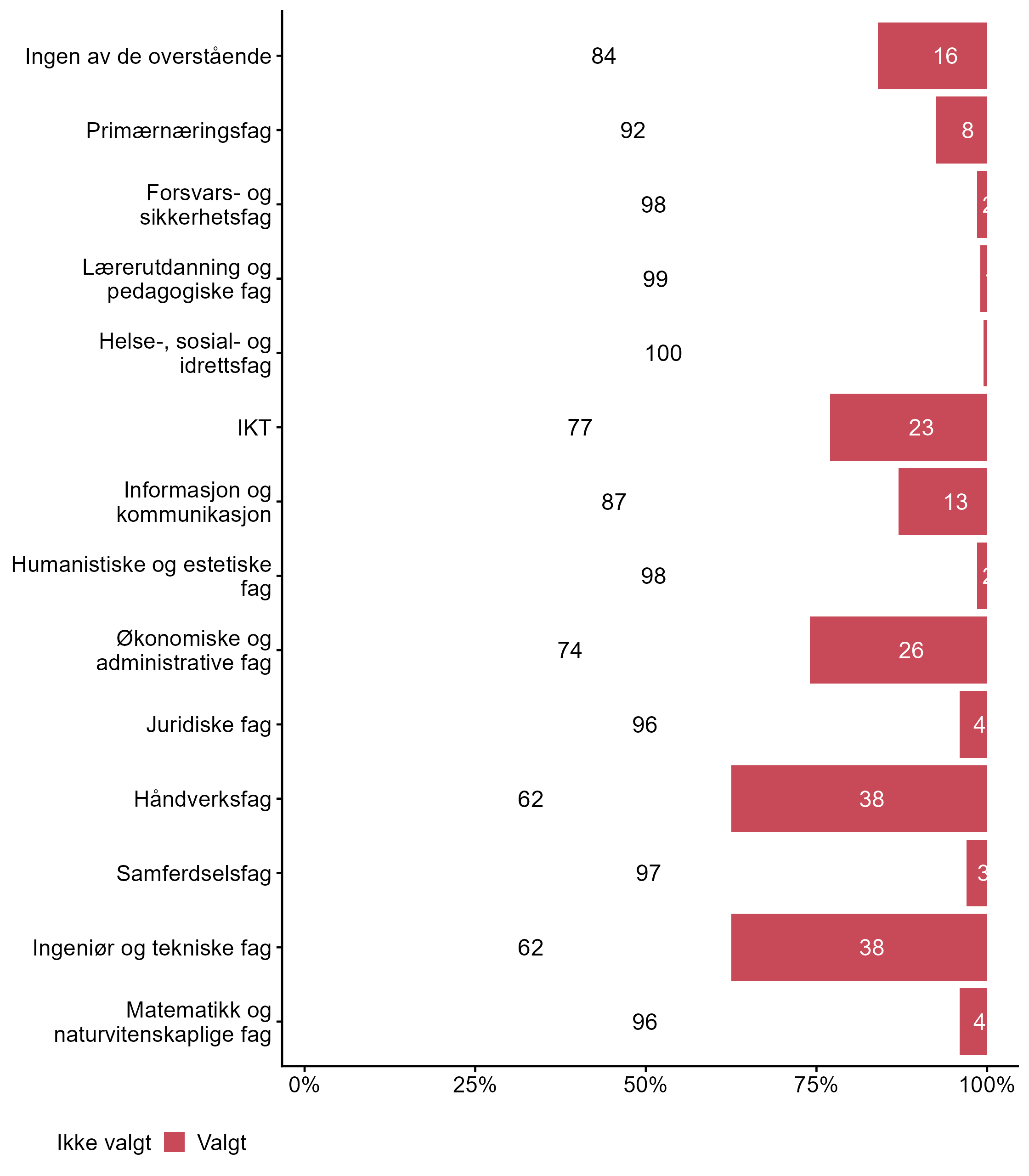 I figur 1 følger prosentandelen av bedriftene som har svart de ulike fagområdene for hele utvalget.