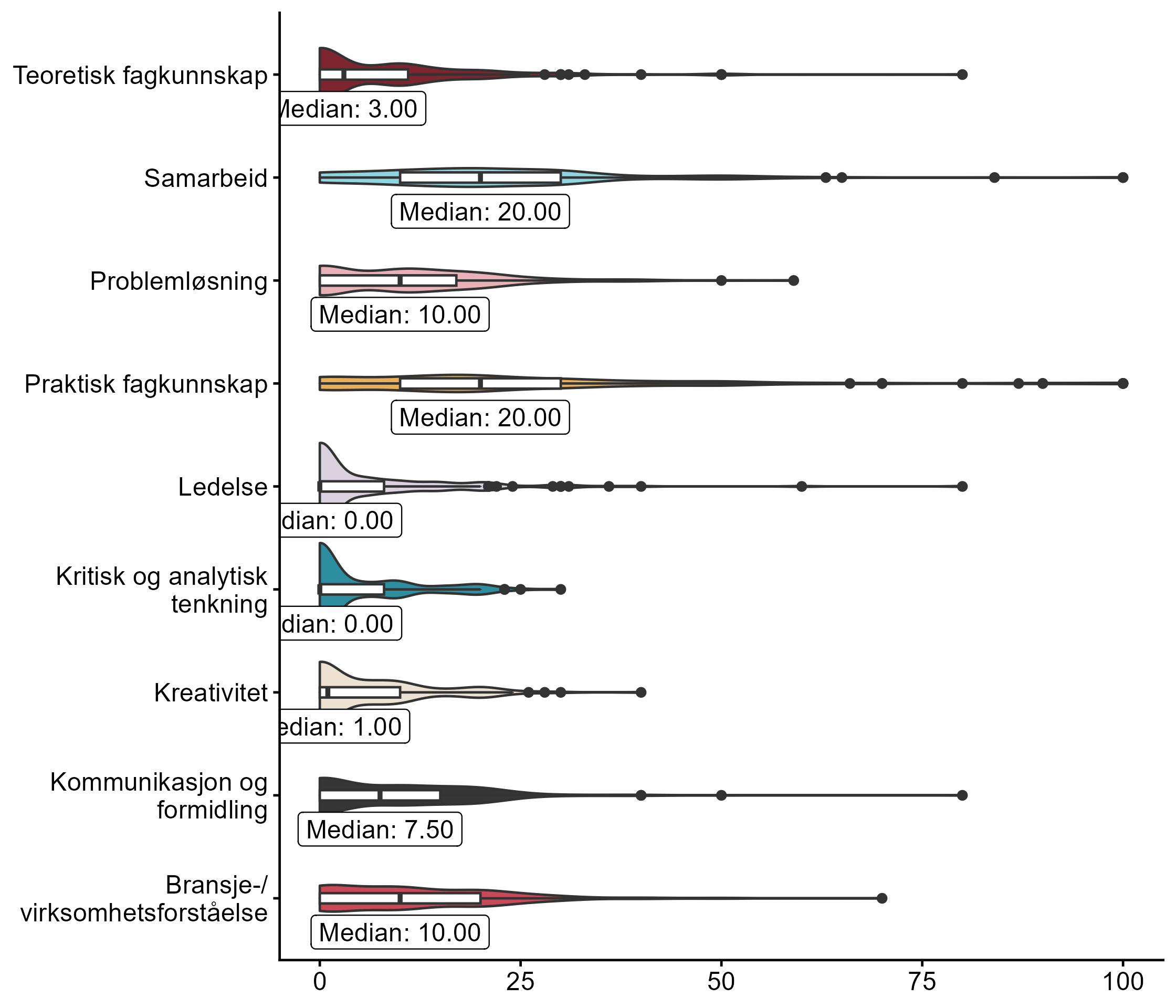 Vi ba også bedriftene se for seg at de skulle ansette en person de neste tre månedene, og ba dem rangere ulike egenskaper, der de ga mest poeng til egenskapene de anså som viktigst i vurdering av søkere. Fordelingen vises i figur 5.