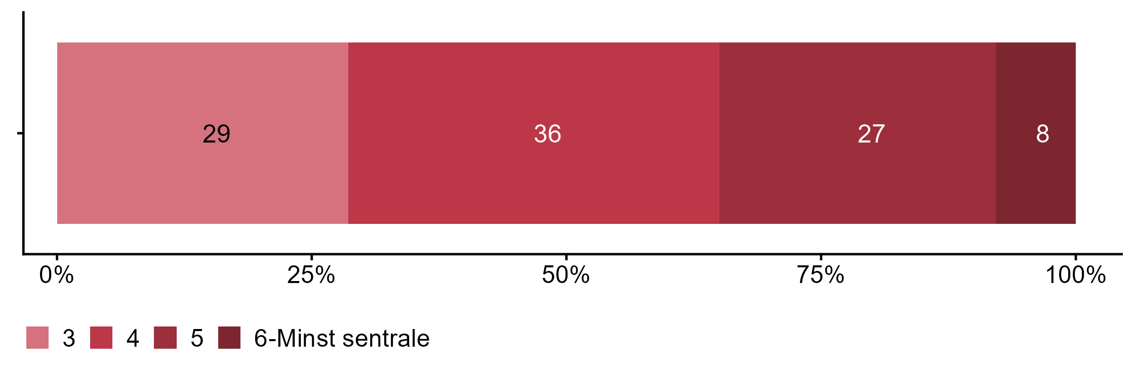 Kapittelet viser en overordnet fordeling på antall ansatte i bedrifter som har deltatt i undersøkelsen i figur 1, hvor stor andel av bedriftene som har svart fordelt på sentralitet i figur 2 og andelen svart fra hvert fylke i figur 3. Der det har vært mer oversiktlig å presentere sentralitet på en 3-delt skala har vi gjort dette.