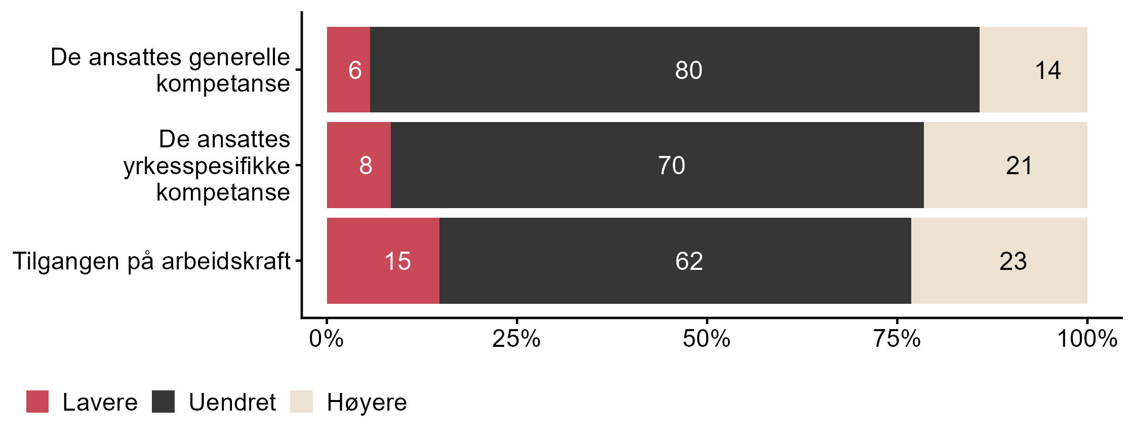 I dette kapittelet kan du sammenligne NHO Møre og Romsdal med andre bedrifters svar på spørsmål om endring i kompetansebehov. Dette inkluderer om det udekte kompetansebehovet har blitt høyere, lavere eller uendret de siste tolv månedene, og spørsmål om hvilke områder som i størst grad har påvirket kompetansebehovet til bedriften. Resultatene vises i figur 1 og figur 2