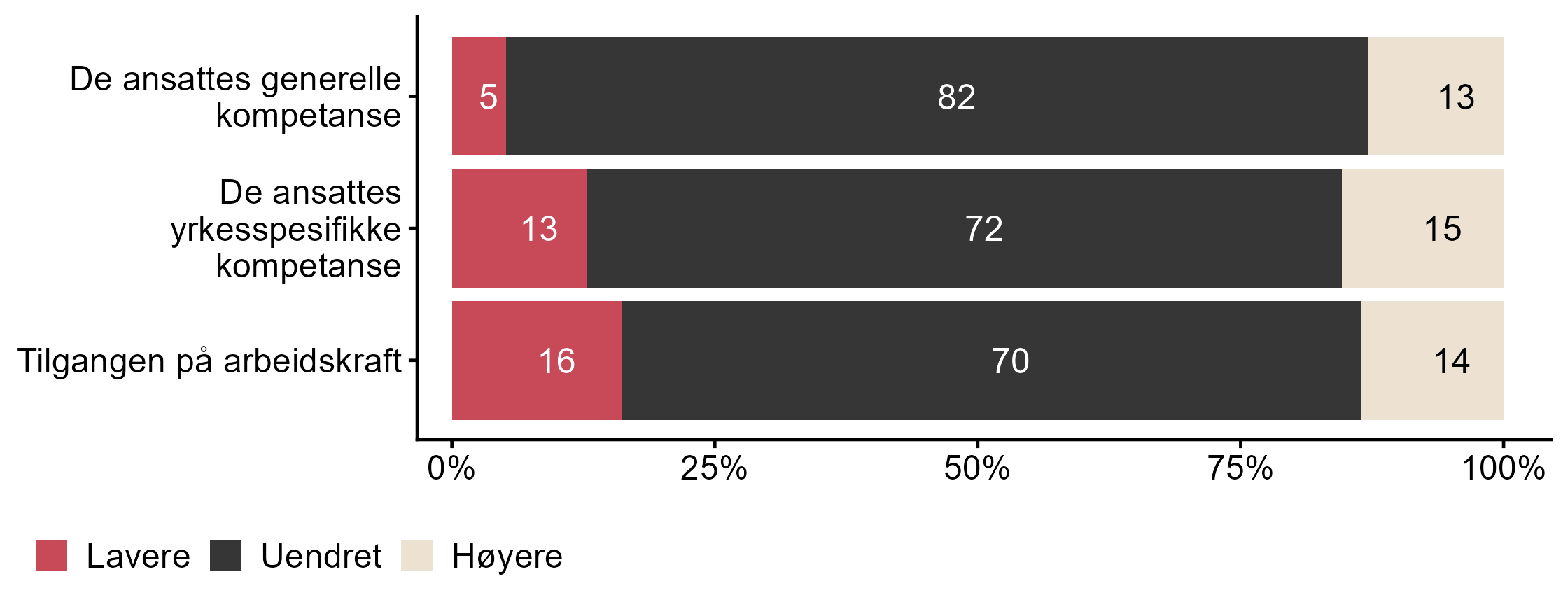 I dette kapittelet kan du sammenligne NHO Nordland med andre bedrifters svar på spørsmål om endring i kompetansebehov. Dette inkluderer om det udekte kompetansebehovet har blitt høyere, lavere eller uendret de siste tolv månedene, og spørsmål om hvilke områder som i størst grad har påvirket kompetansebehovet til bedriften. Resultatene vises i figur 1 og figur 2