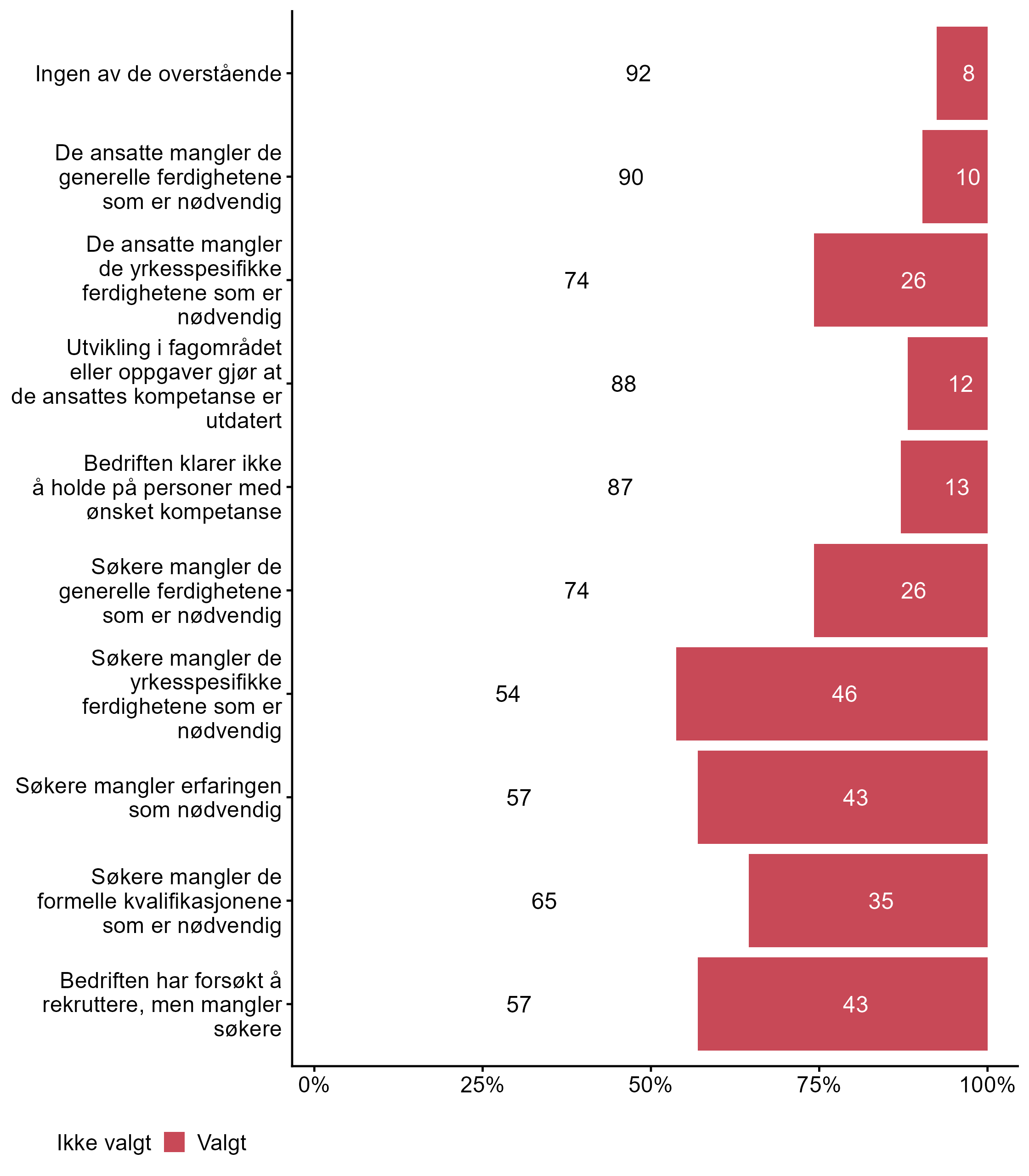 De som svarte “I noen grad” eller “I stor grad” på spørsmål om bedriften har et udekket kompetansebehov i dag, ble spurt om årsaker til og konsekvenser av kompetansebehovet, og ble bedt om å krysse av for det som passer best for bedriften. Svarfordelingen vises i figur 3 og figur 4.