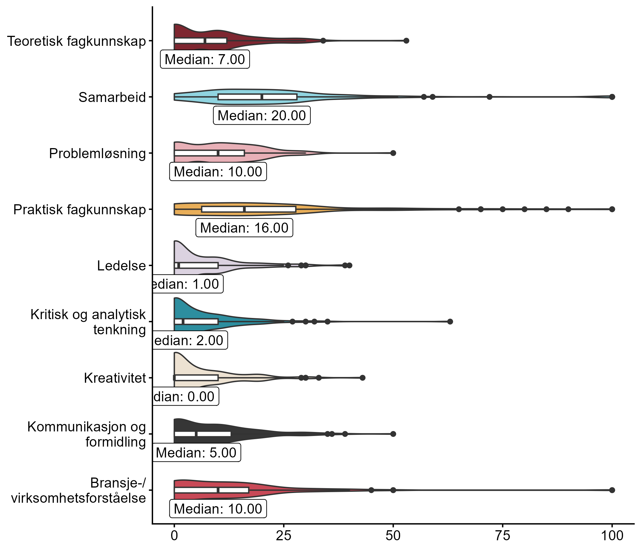 Vi ba også bedriftene se for seg at de skulle ansette en person de neste tre månedene, og ba dem rangere ulike egenskaper, der de ga mest poeng til egenskapene de anså som viktigst i vurdering av søkere. Fordelingen vises i figur 5.