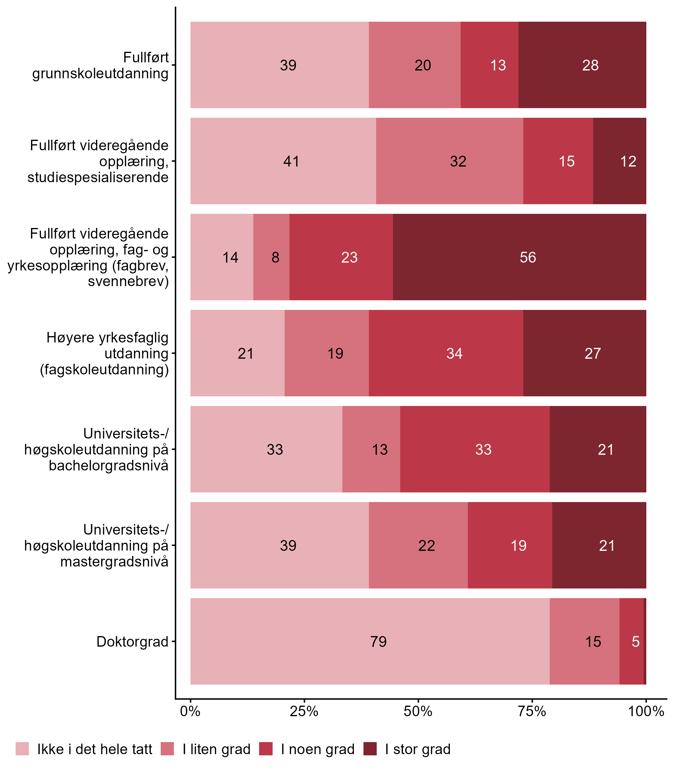Vi spurte bedriftene hvilke utdanningsnivåer som er relevante for bedriften, og presenterer her i figur 2 overordnet prosentandel av bedriftene som har svart de ulike utdanningsnivåene for hele utvalget.