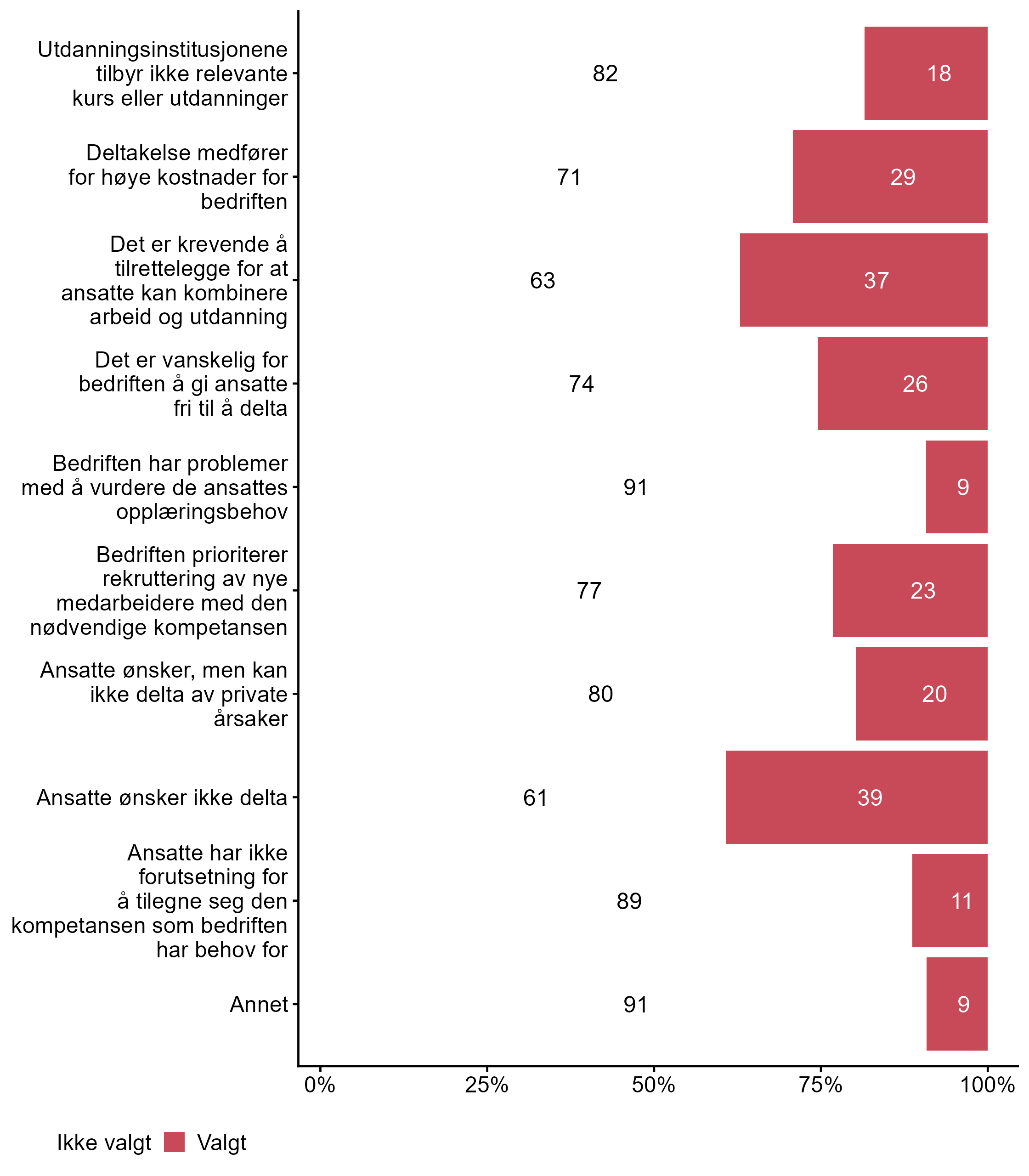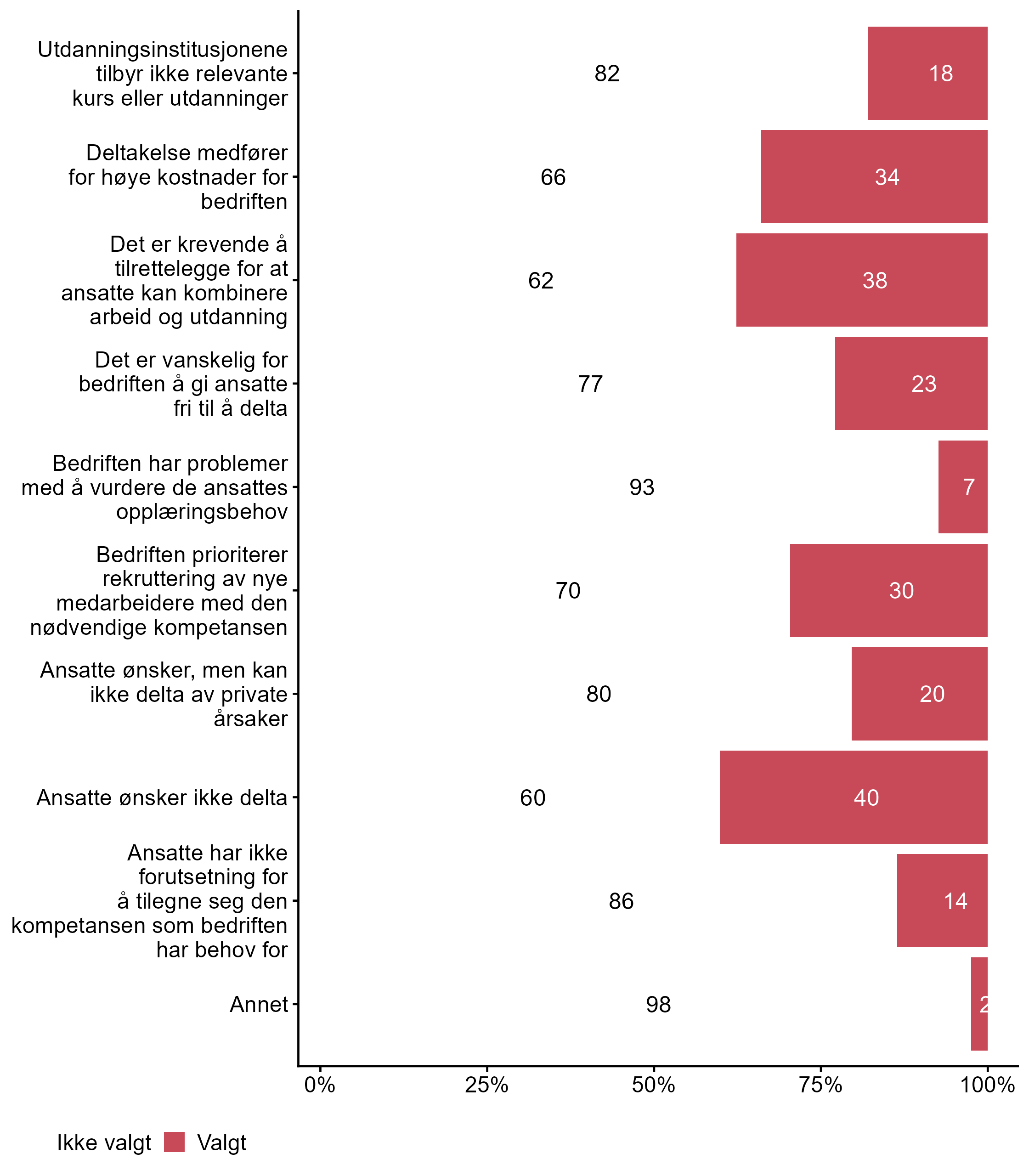 Vi ba bedriftene også krysse av for påstander som beskriver hvorfor ansatte i bedriften begrenser eller ikke deltar i etter- og videreutdanning, svarfordelingen vises i figur 5.