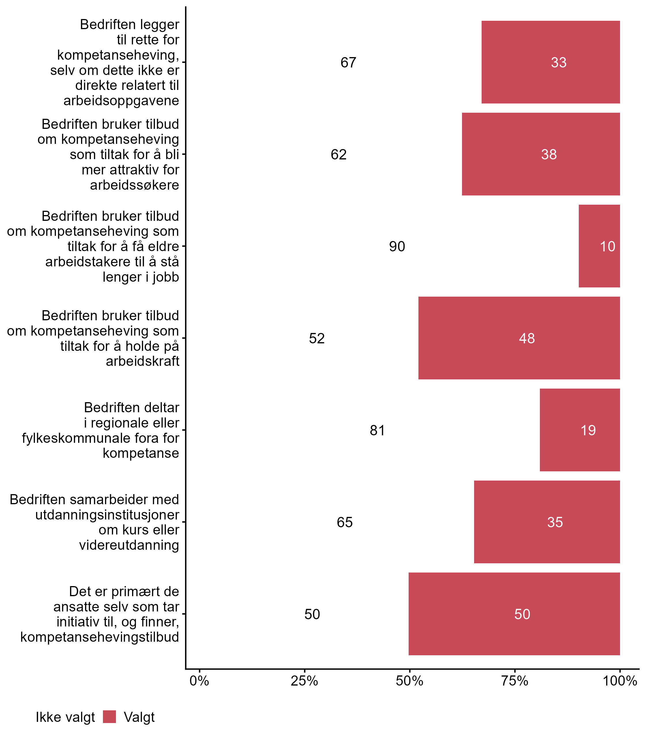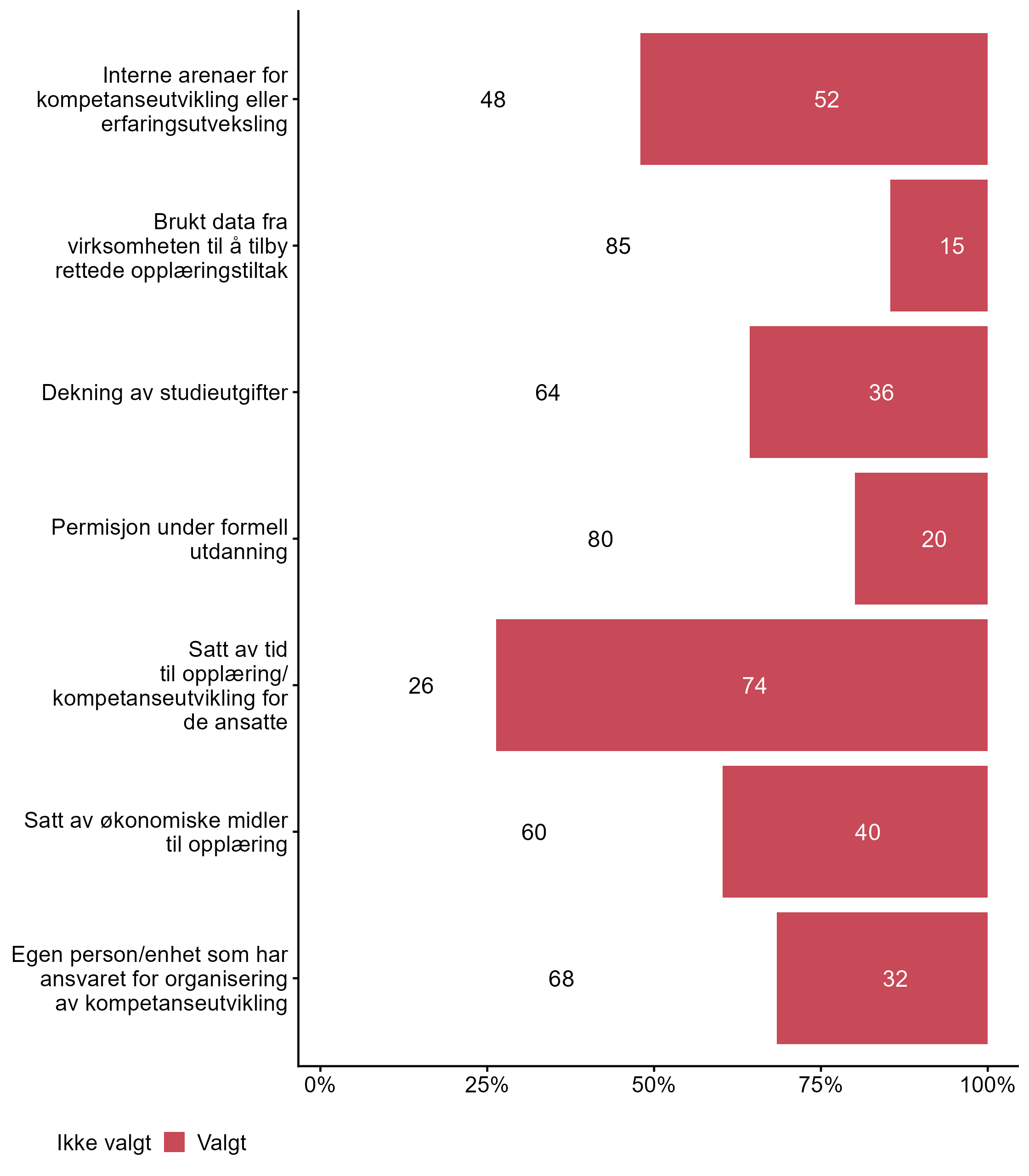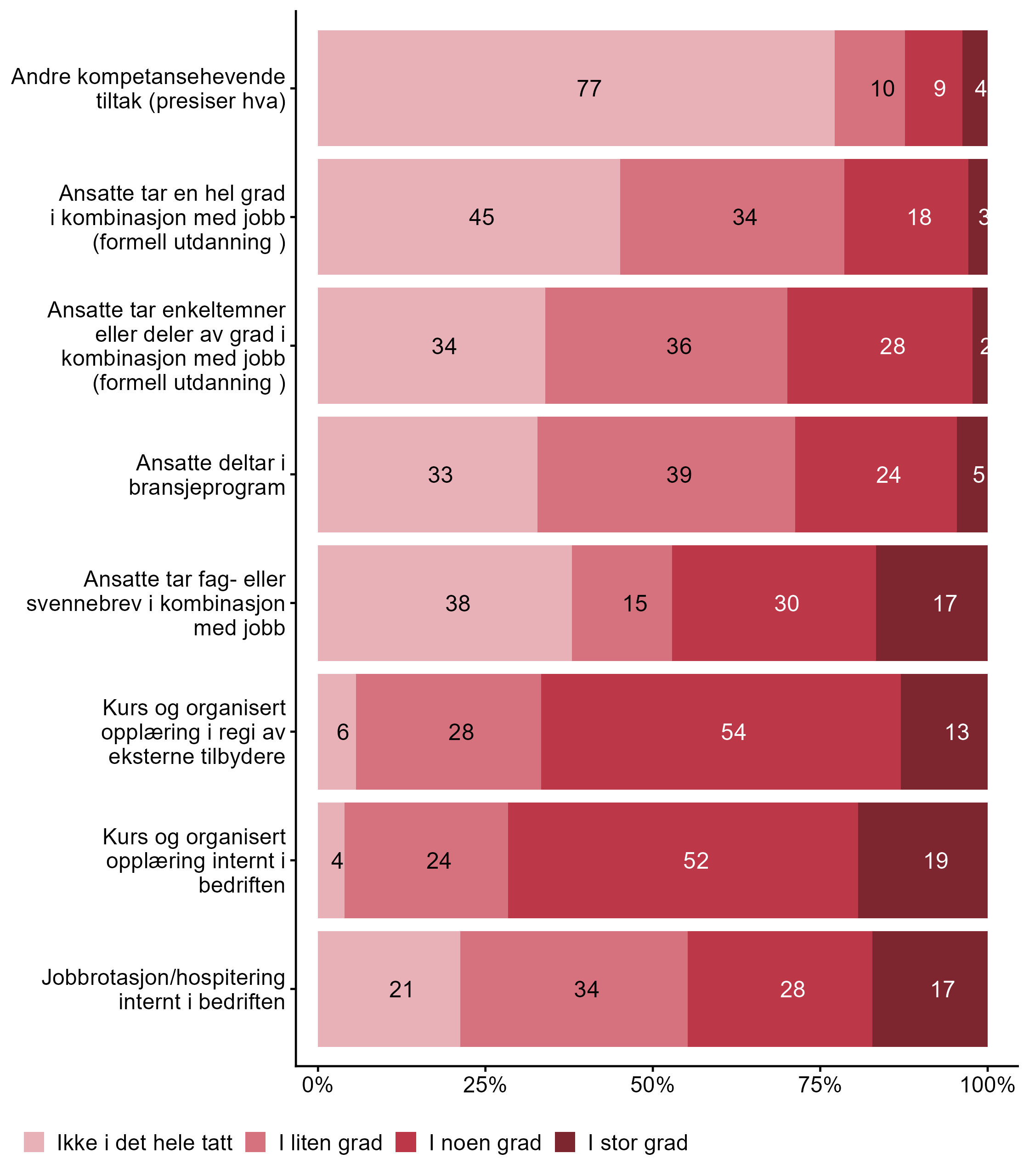 Vi stilte også spørsmål om hvilke tiltak bedriften har hatt for kompetanseutvikling det siste året, svarfordelingen vises i figur 2.