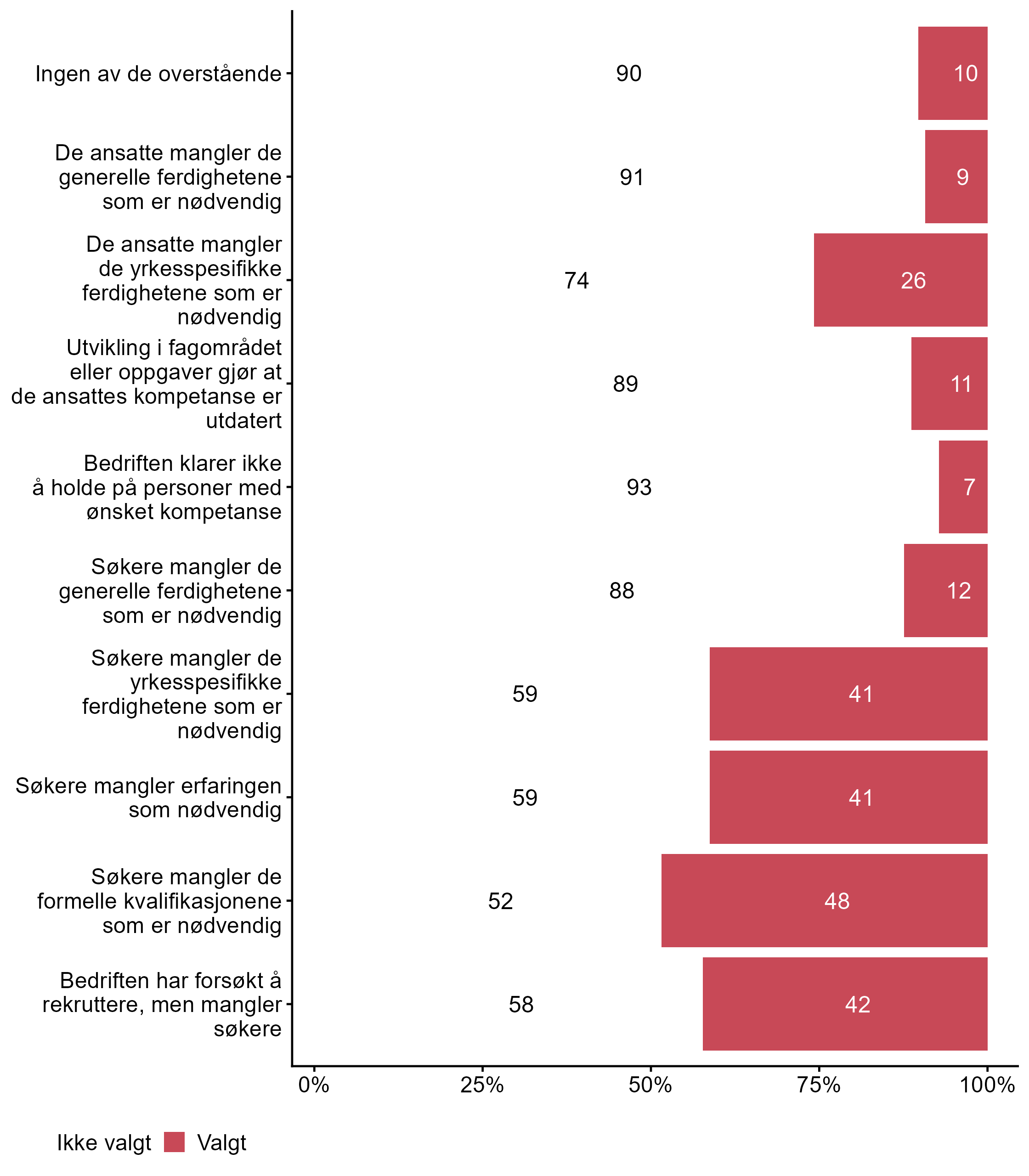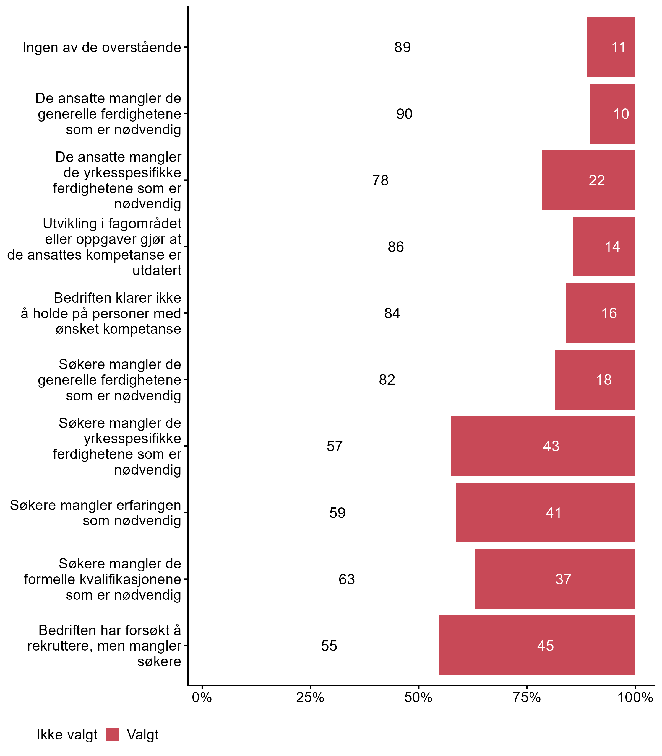 De som svarte “I noen grad” eller “I stor grad” på spørsmål om bedriften har et udekket kompetansebehov i dag, ble spurt om årsaker til og konsekvenser av kompetansebehovet, og ble bedt om å krysse av for det som passer best for bedriften. Svarfordelingen vises i figur 3 og figur 4.
