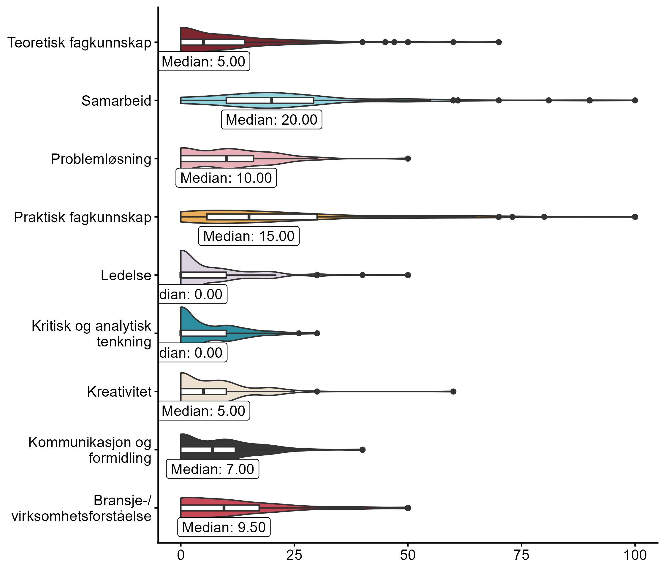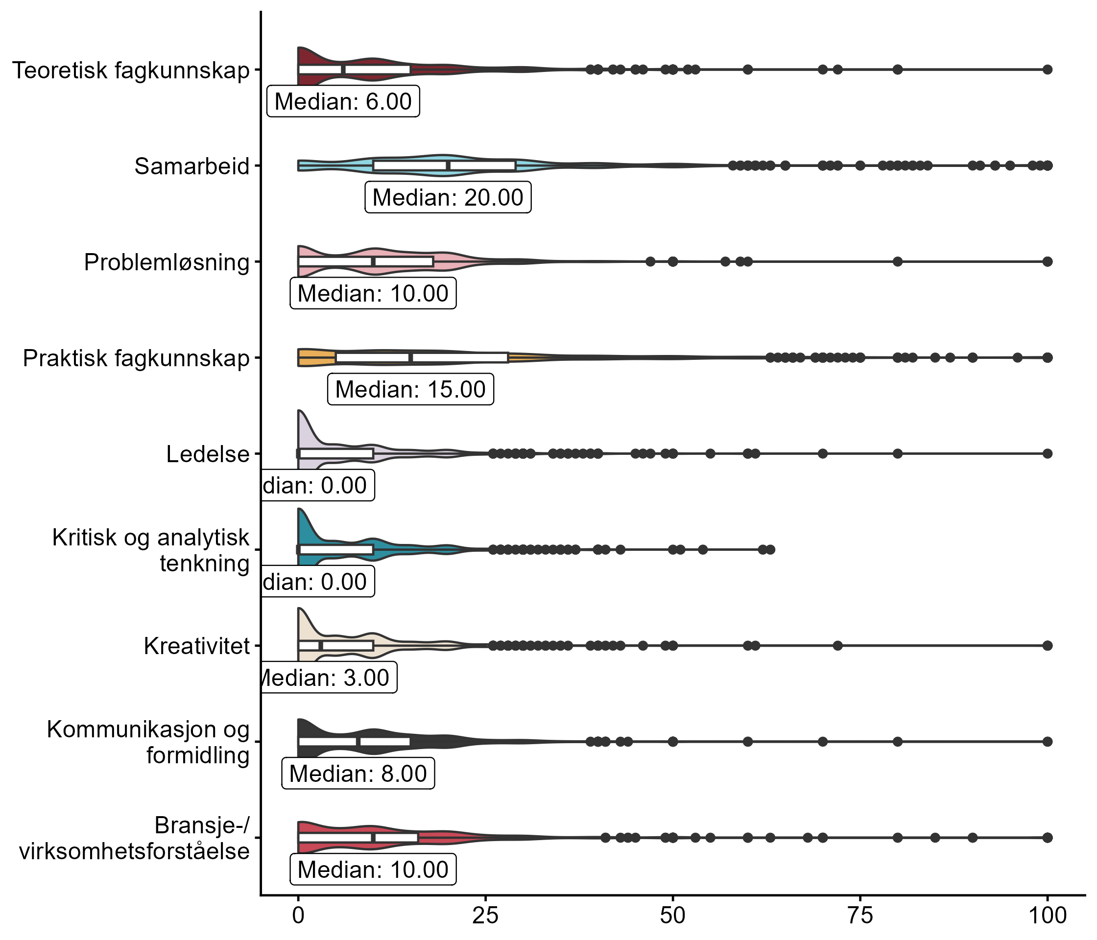 Vi ba også bedriftene se for seg at de skulle ansette en person de neste tre månedene, og ba dem rangere ulike egenskaper, der de ga mest poeng til egenskapene de anså som viktigst i vurdering av søkere. Fordelingen vises i figur 5.