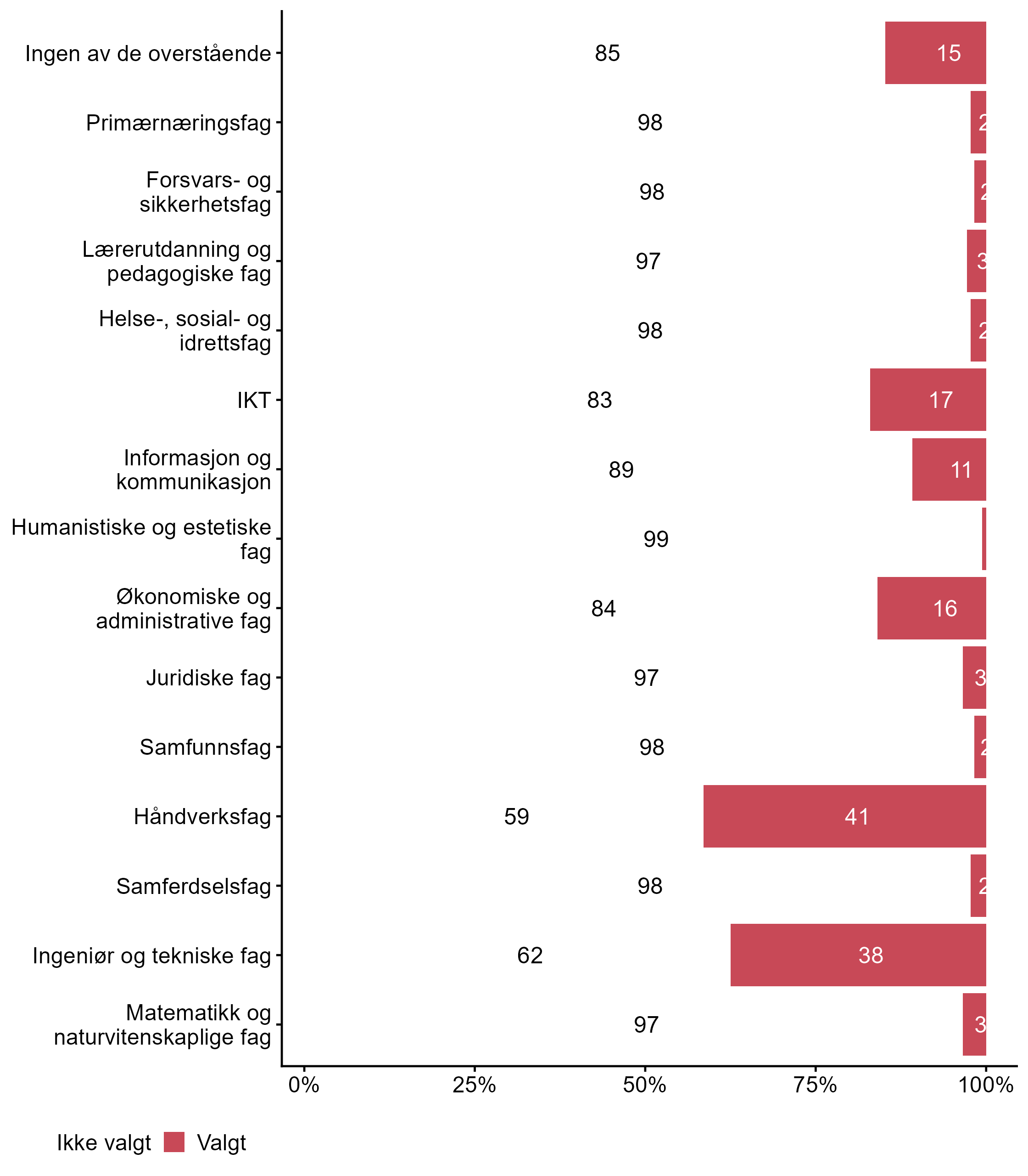 I figur 1 følger prosentandelen av bedriftene som har svart de ulike fagområdene for hele utvalget.