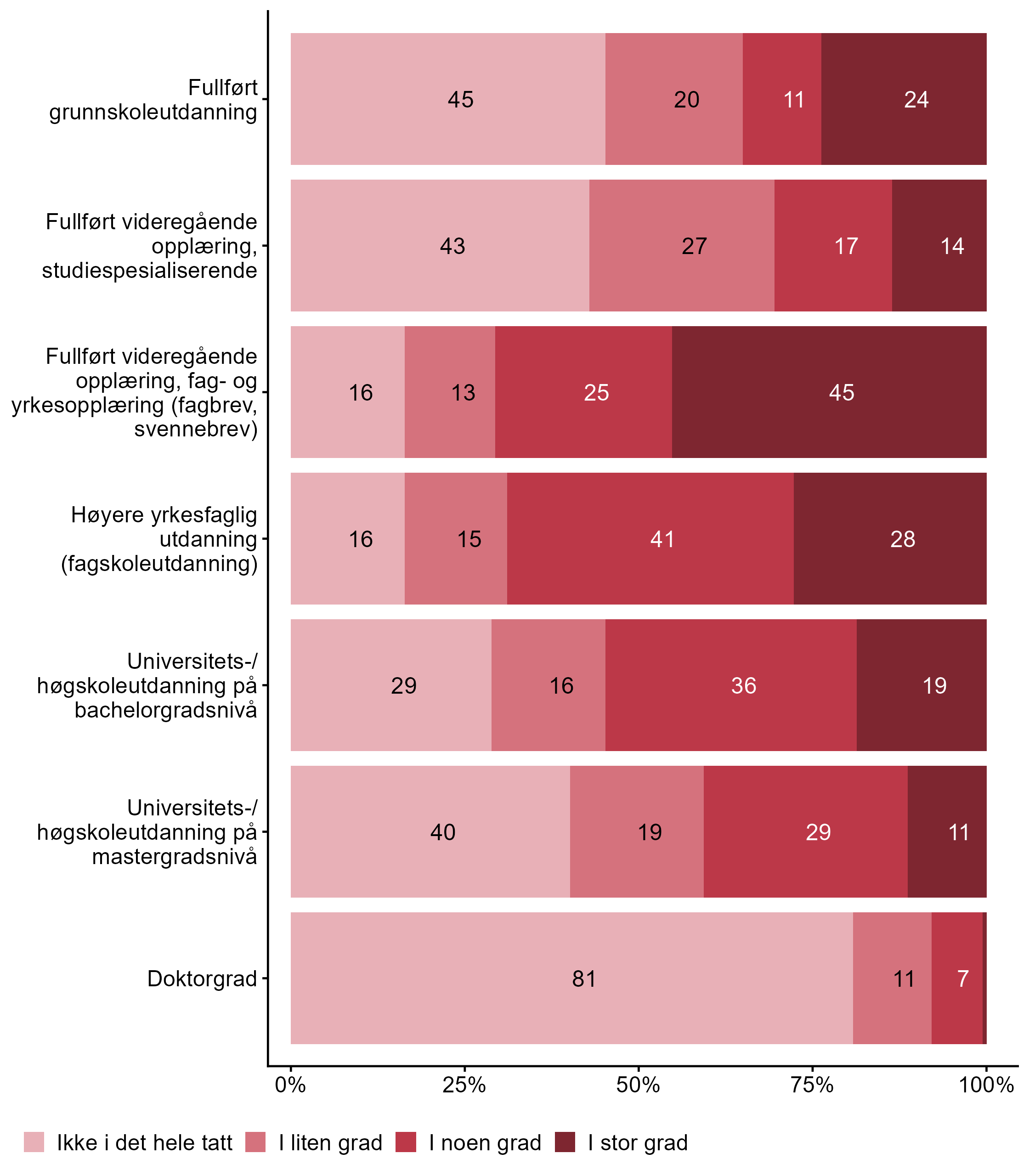 Vi spurte bedriftene hvilke utdanningsnivåer som er relevante for bedriften, og presenterer her i figur 2 overordnet prosentandel av bedriftene som har svart de ulike utdanningsnivåene for hele utvalget.