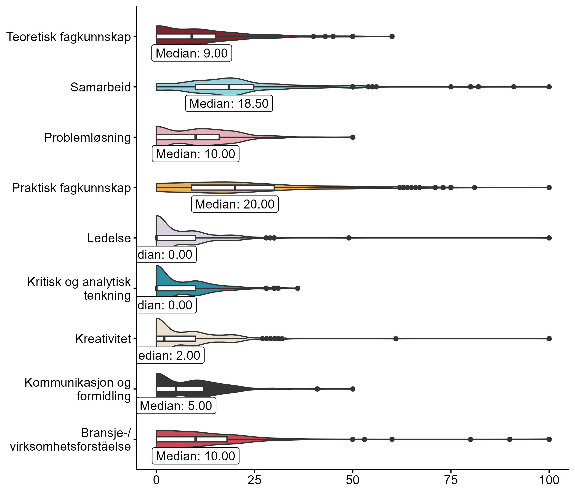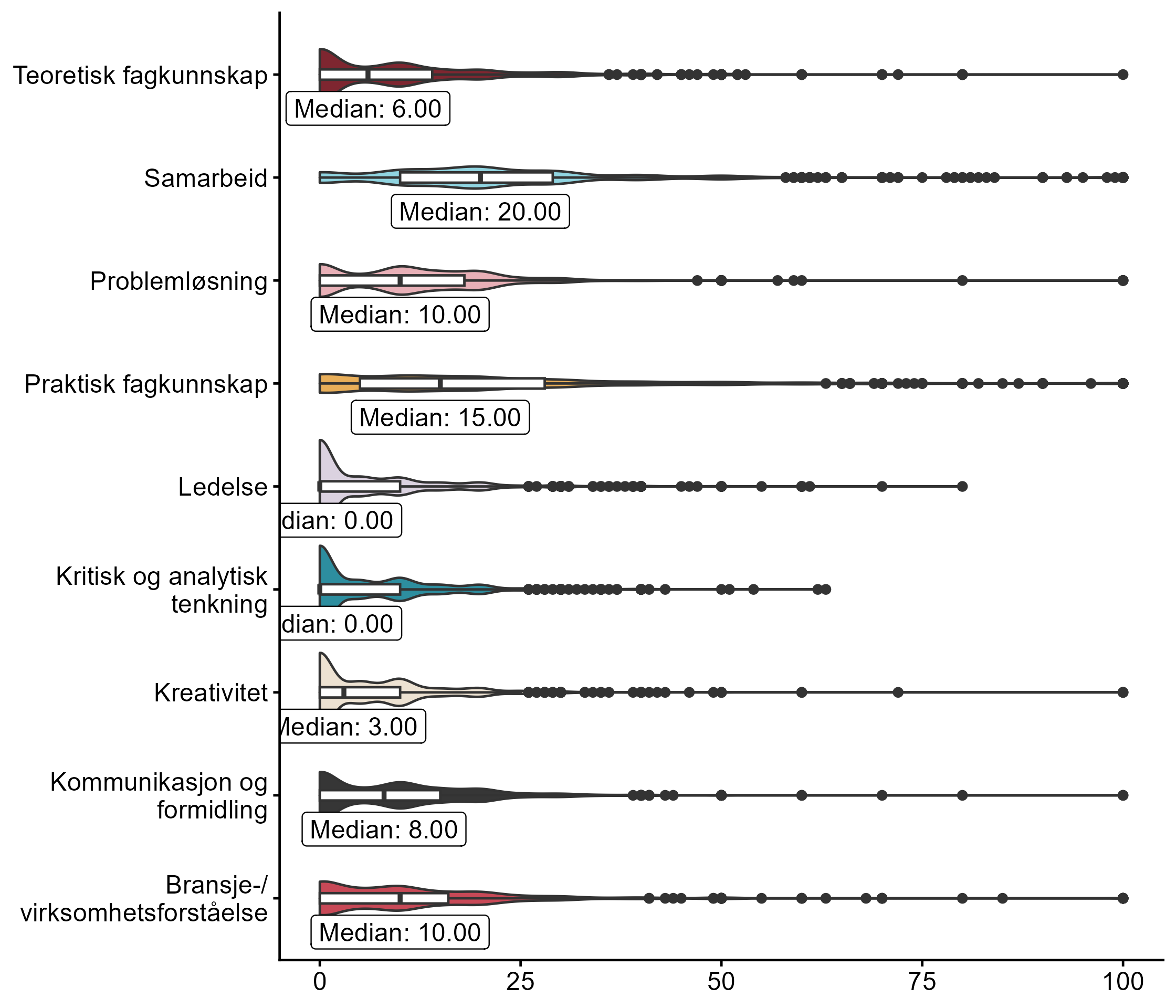 Vi ba også bedriftene se for seg at de skulle ansette en person de neste tre månedene, og ba dem rangere ulike egenskaper, der de ga mest poeng til egenskapene de anså som viktigst i vurdering av søkere. Fordelingen vises i figur 5.