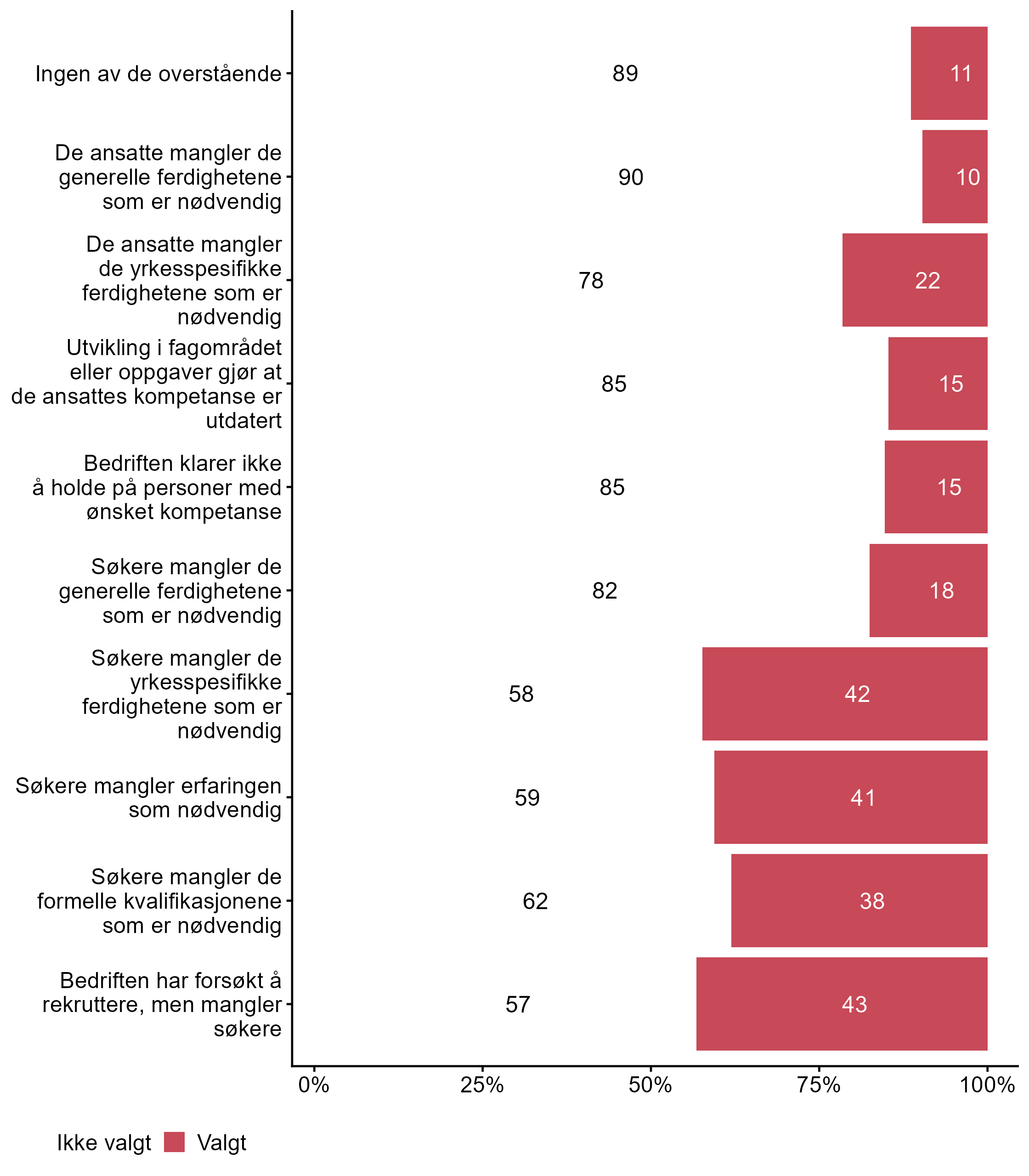 De som svarte “I noen grad” eller “I stor grad” på spørsmål om bedriften har et udekket kompetansebehov i dag, ble spurt om årsaker til og konsekvenser av kompetansebehovet, og ble bedt om å krysse av for det som passer best for bedriften. Svarfordelingen vises i figur 3 og figur 4.