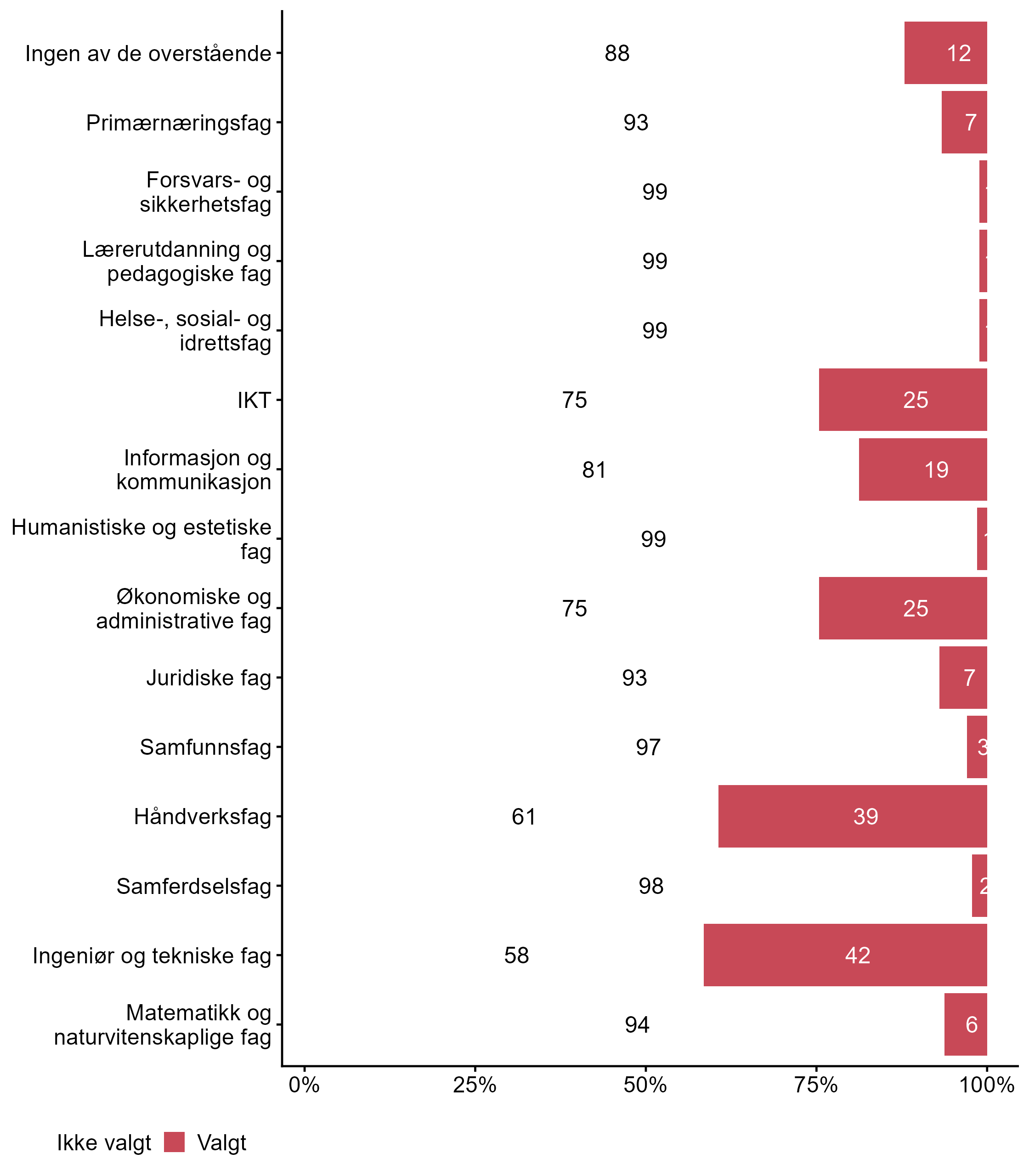 I figur 1 følger prosentandelen av bedriftene som har svart de ulike fagområdene for hele utvalget.
