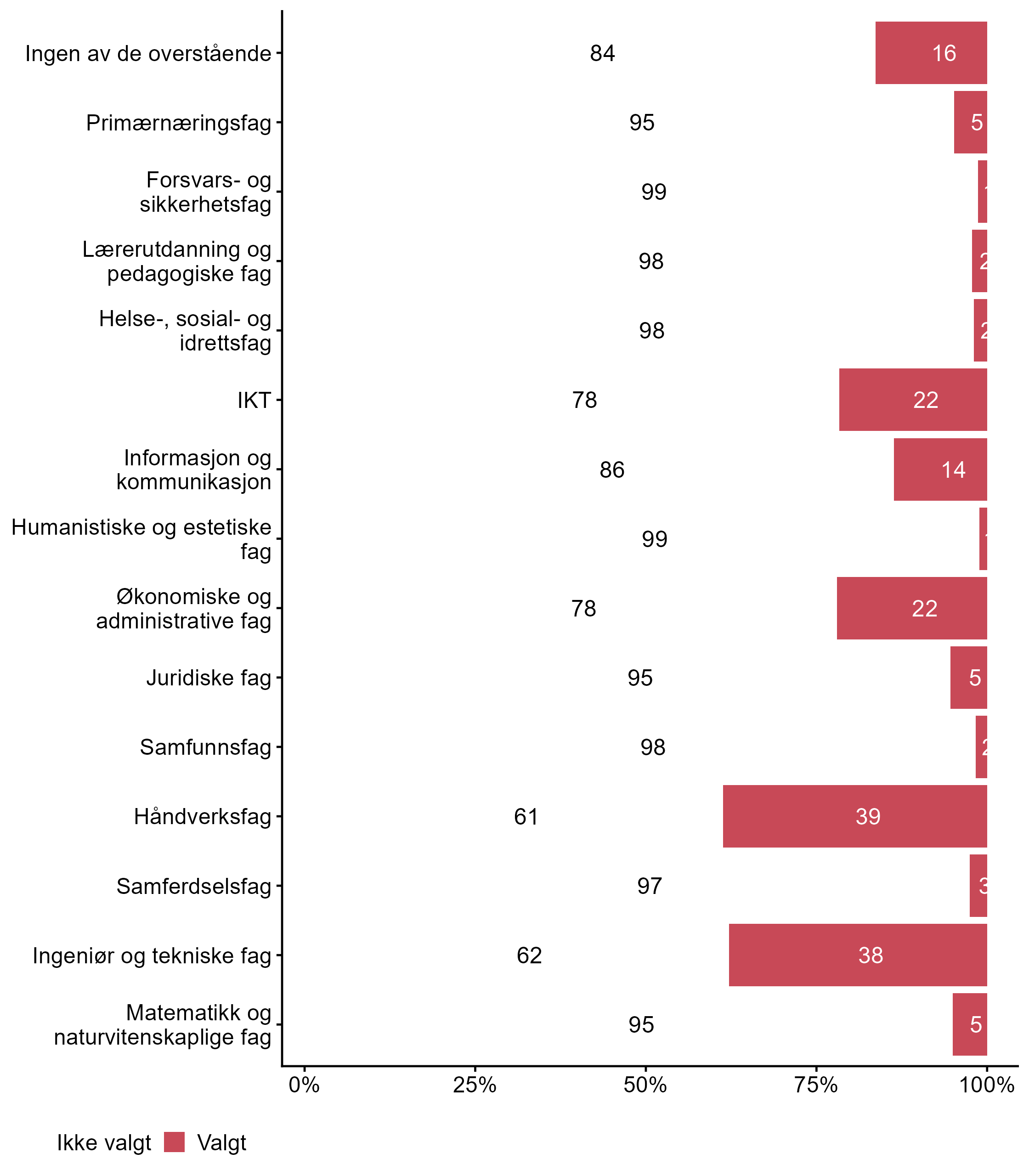 For påstanden Håndverksfag var det færre som svarte Valgt i målgruppen (0,28) enn blant andre (0,39).