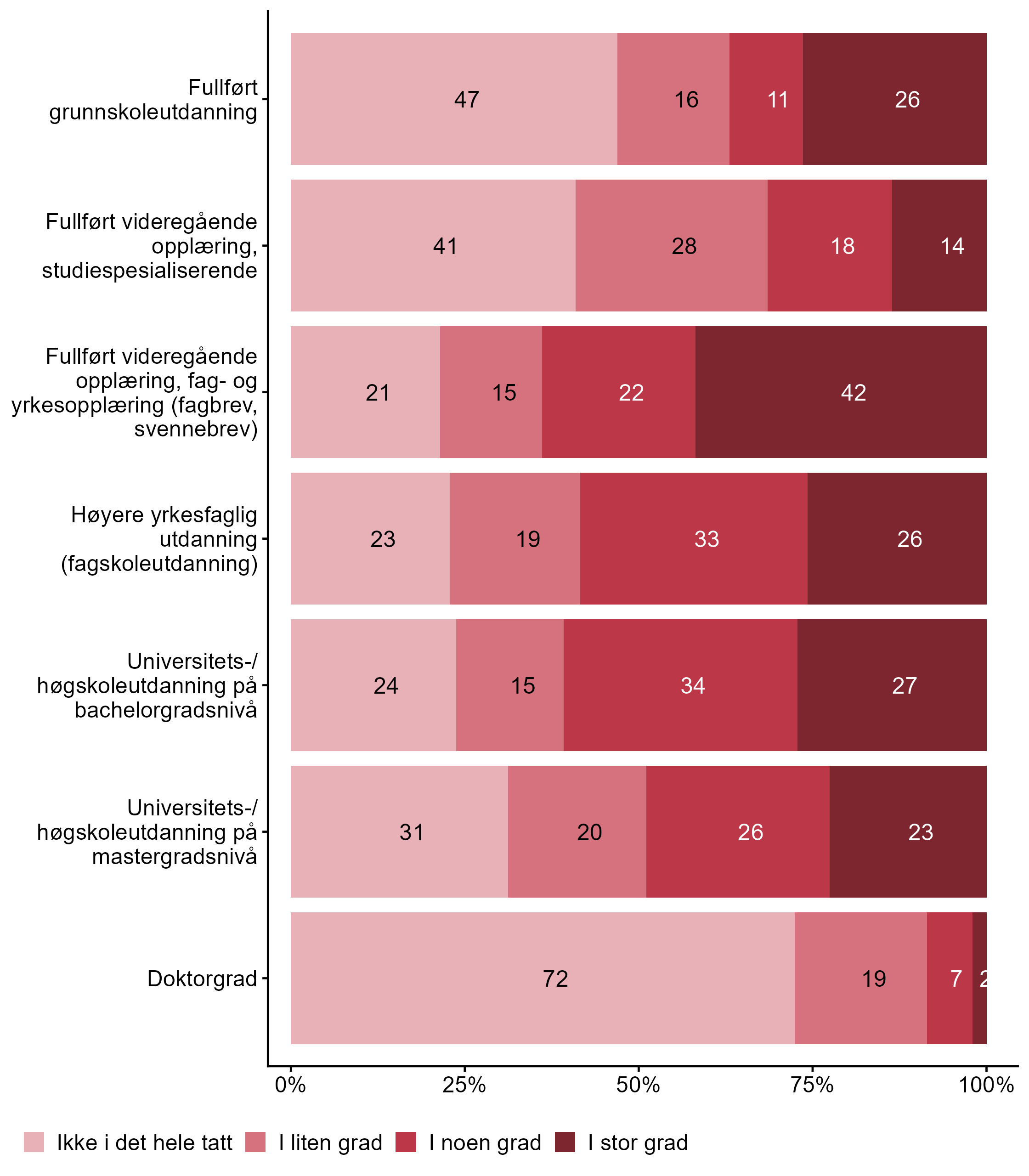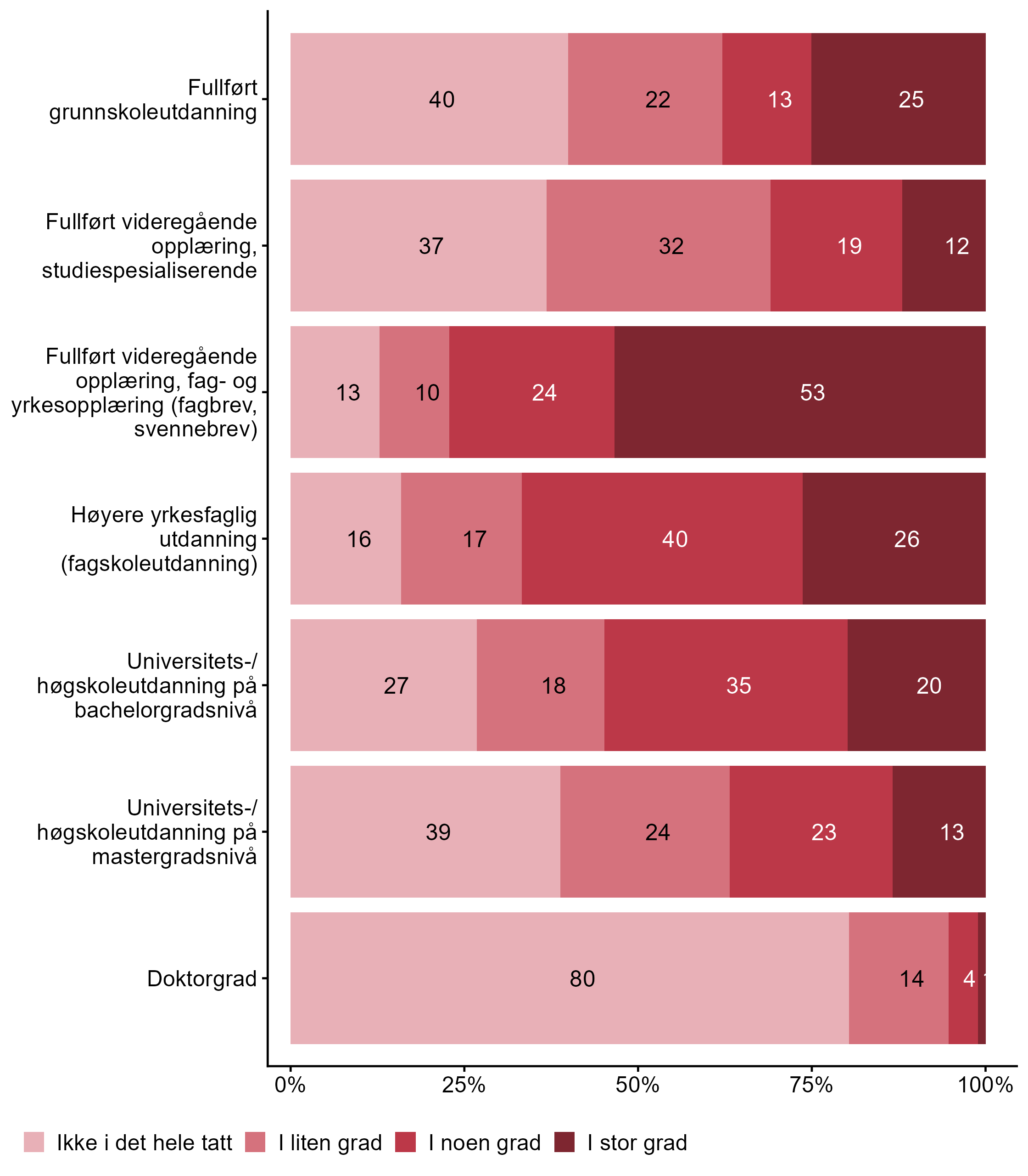 For Universitets-/høgskoleutdanning på mastergradsnivå har målgruppen en høyere andel respondenter (0,49) enn alle andre (0,37) som svarte I noen grad eller I stor grad. For påstanden Fullført videregående opplæring, fag- og yrkesopplæring (fagbrev, svennebrev) var det færre som svarte I noen grad eller I stor grad i målgruppen (0,64) enn blant andre (0,77).