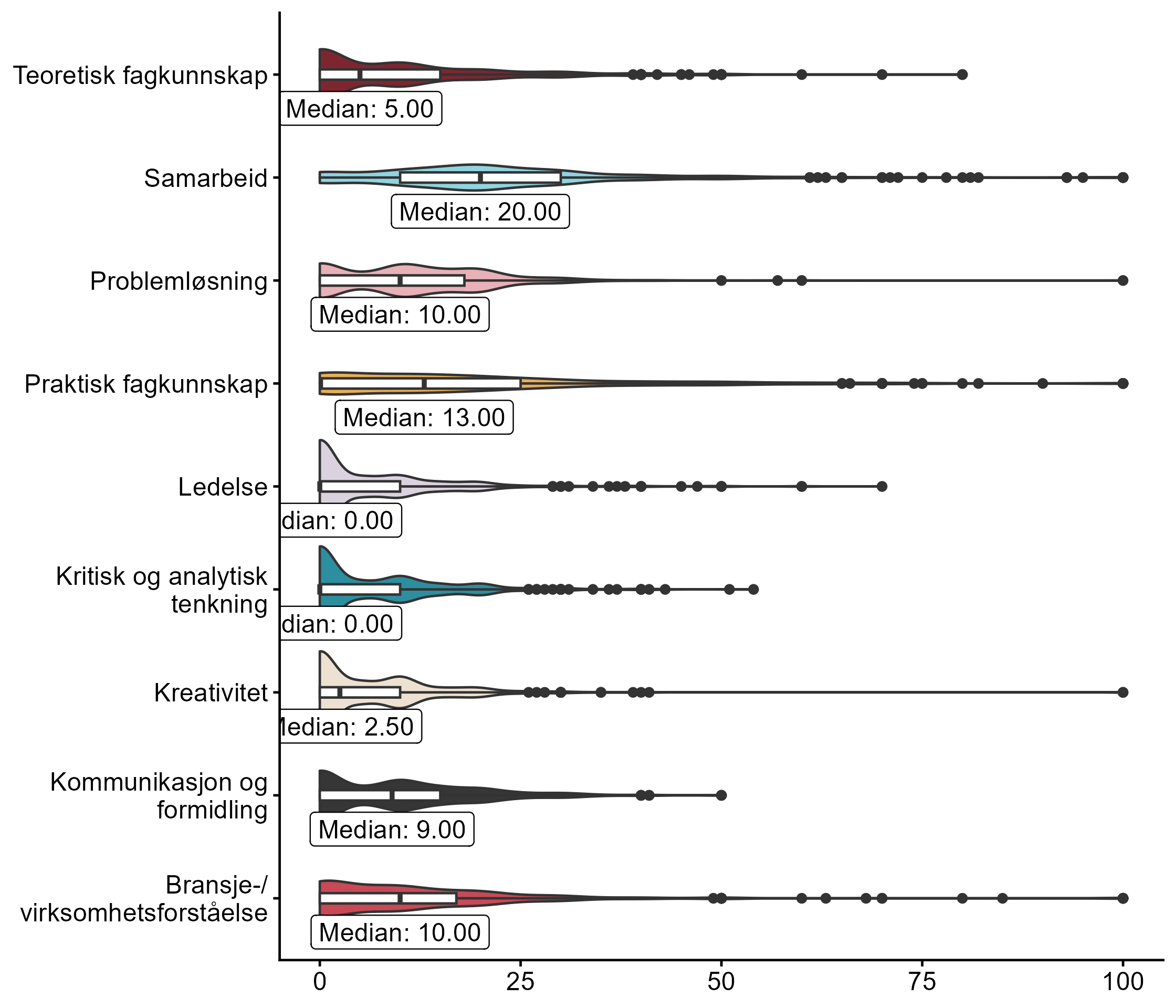 Vi ba også bedriftene se for seg at de skulle ansette en person de neste tre månedene, og ba dem rangere ulike egenskaper, der de ga mest poeng til egenskapene de anså som viktigst i vurdering av søkere. Fordelingen vises i figur 5.